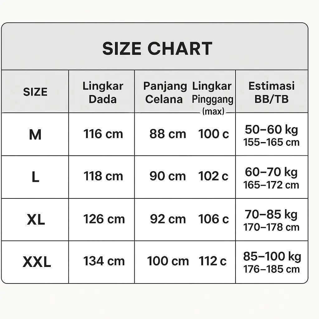 ·Estimasi BB/TB: 50–60 kg / 155–165 cm