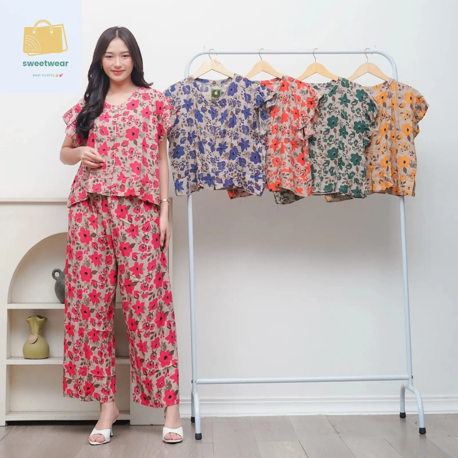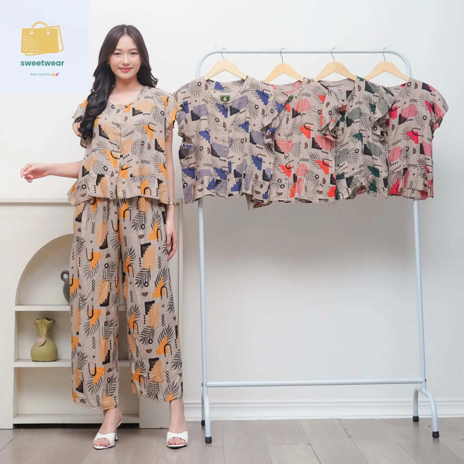 Stelan one set adalah pilihan tepat untuk gaya santai Anda. Terdiri dari celana panjang 7/8 dan baju santai, stelan ini cocok untuk aktivitas sehari-hari.