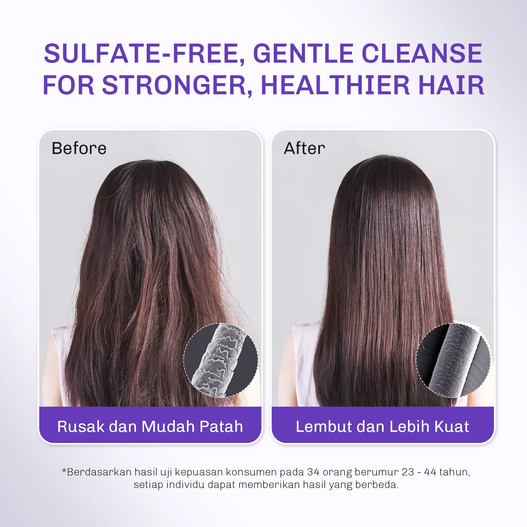 Sampo harian bebas sulfat dengan tiga surfaktan lembut dari asam amino dan gula (Decyl Glucoside, Cocamidopropyl Betaine, Sodium Methyl Cocoyl Taurate) yang membersihkan tanpa membuat rambut kering, memberikan rambut halus dan berkilau pada keramas pertama, serta menjaga kulit kepala tetap segar dan nyaman untuk mendapatkan rambut sehat yang tampak lembut.