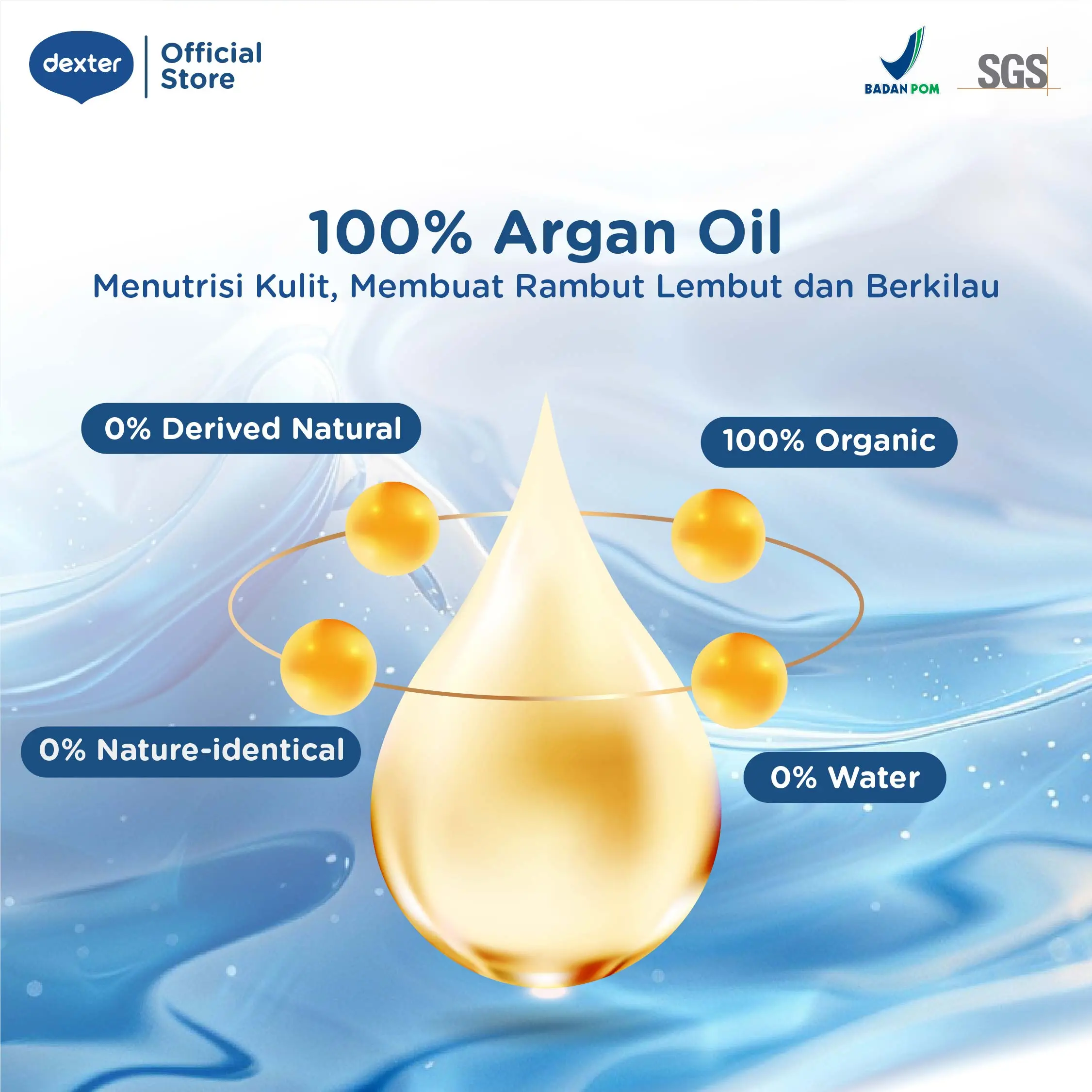 Argan Oil yang digunakan 100% dari organic farming bekerja sebagai lightweight natural conditioner bermanfaat melembutkan tanpa membuat lepek, menjaga kelembapan tanpa rasa berat, mengurangi kusut secara signifikan.