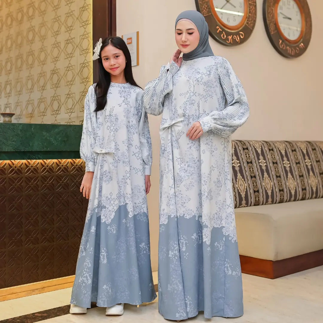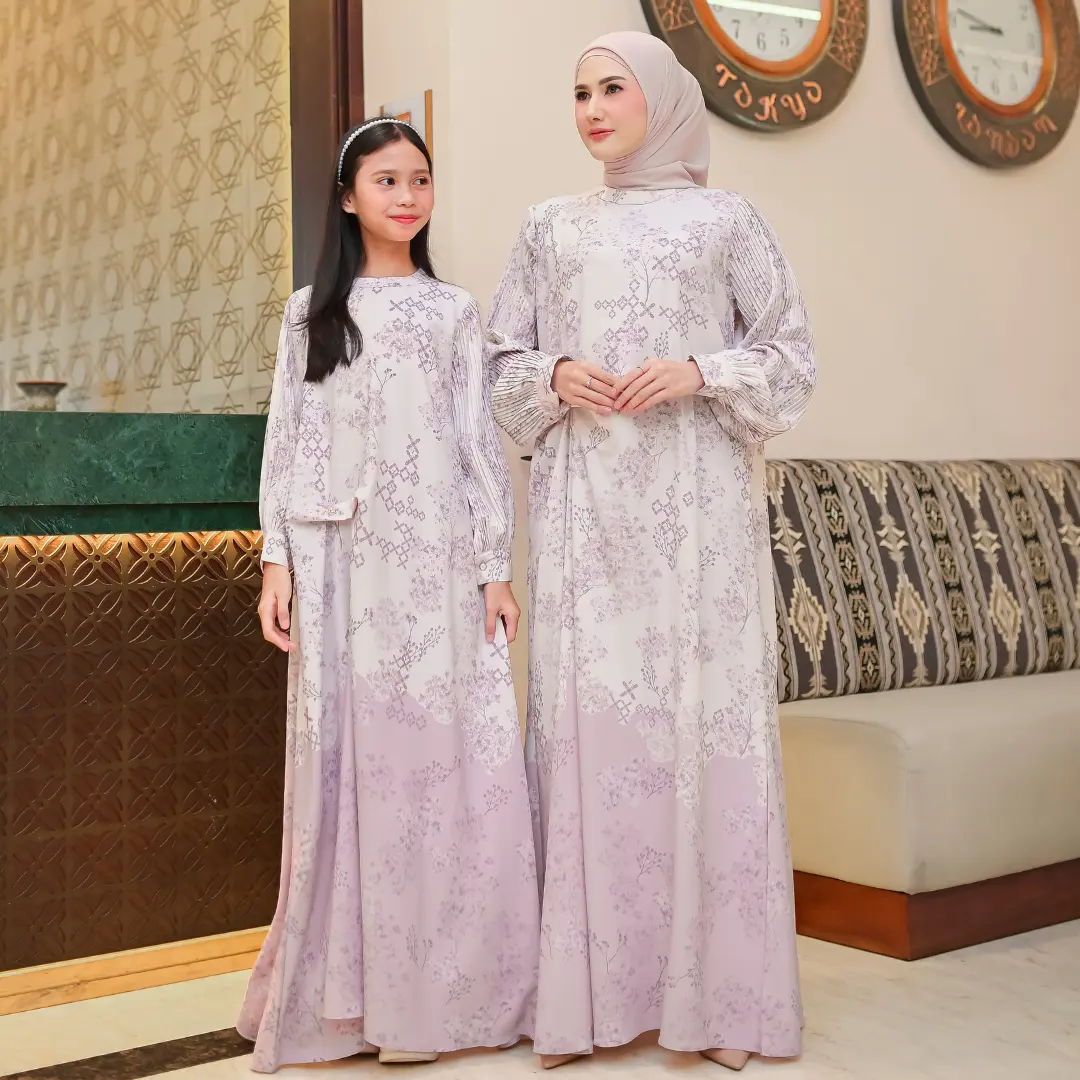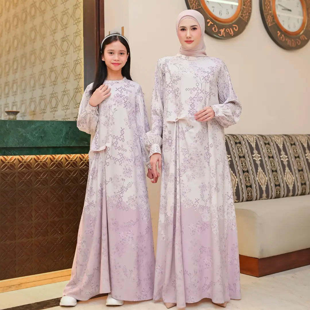 Aisyalina Id Couple Mom and Kids Arissa Dress Series Tanpa Hijab Bahan Katun Tunica Dress Gamis Wanita Ibu Anak Printing Plisket