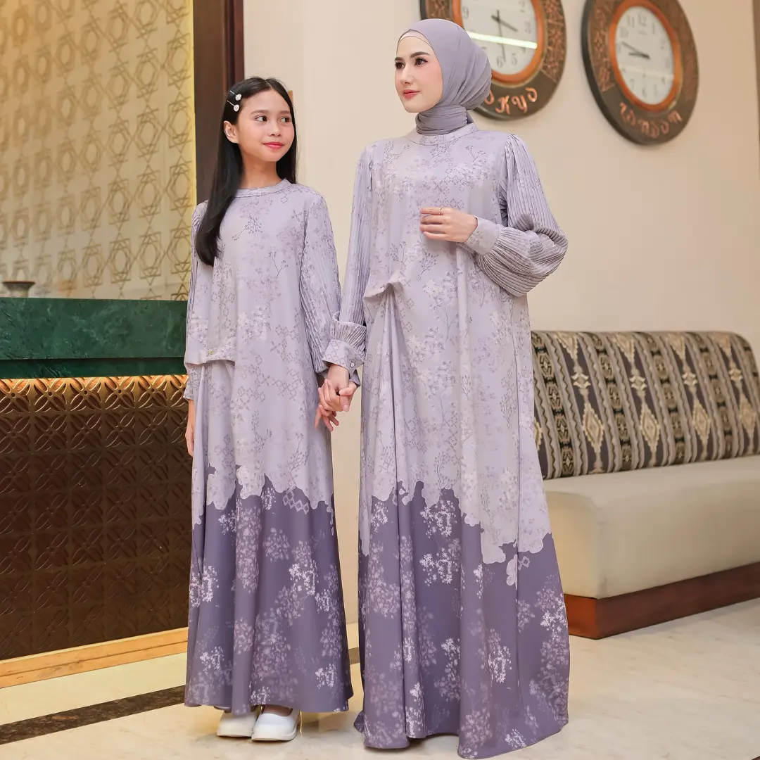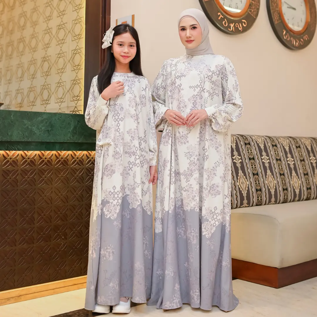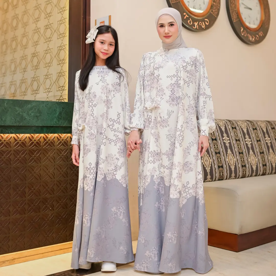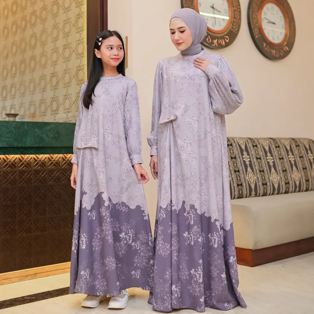 Aisyalina Id Couple Mom and Kids Arissa Dress Series Tanpa Hijab Bahan Katun Tunica Dress Gamis Wanita Ibu Anak Printing Plisket