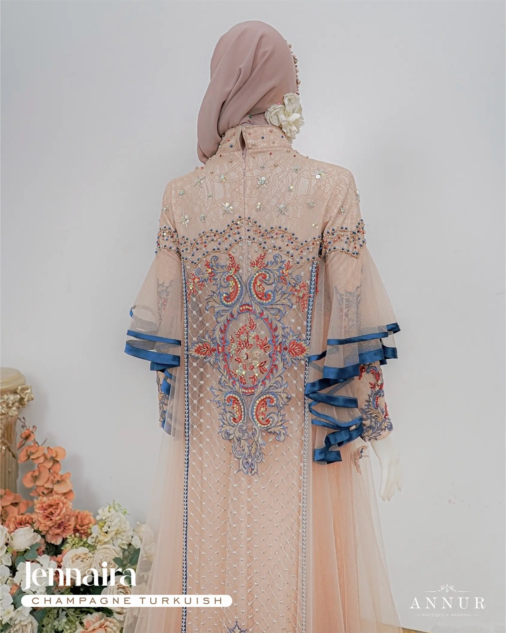 Bahan: furing maxmara, dilapisi chantily, tulle polos, dan motif bordir ethereal yang indah dan mewah, serta dihiasi motif bunga 3D yang cantik.