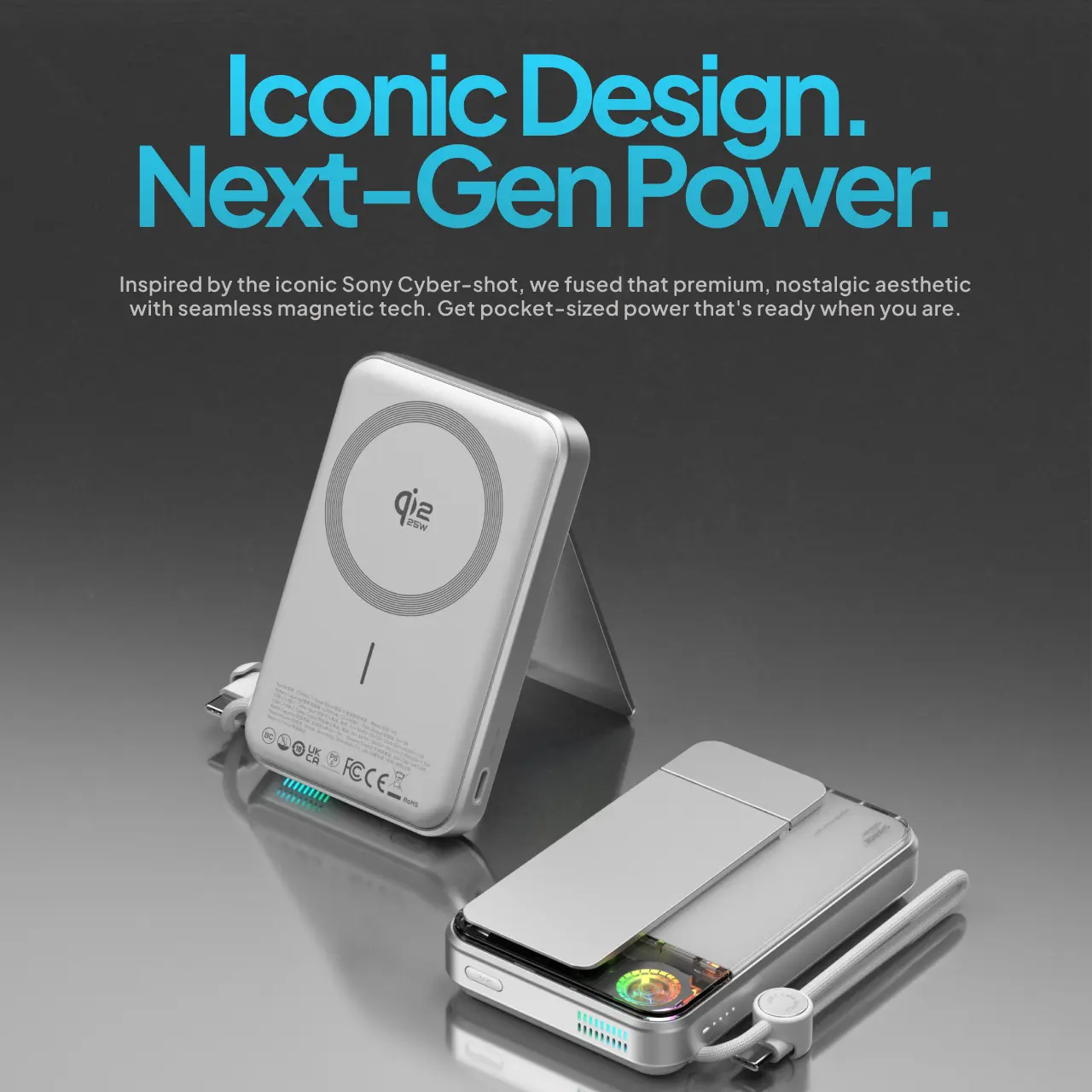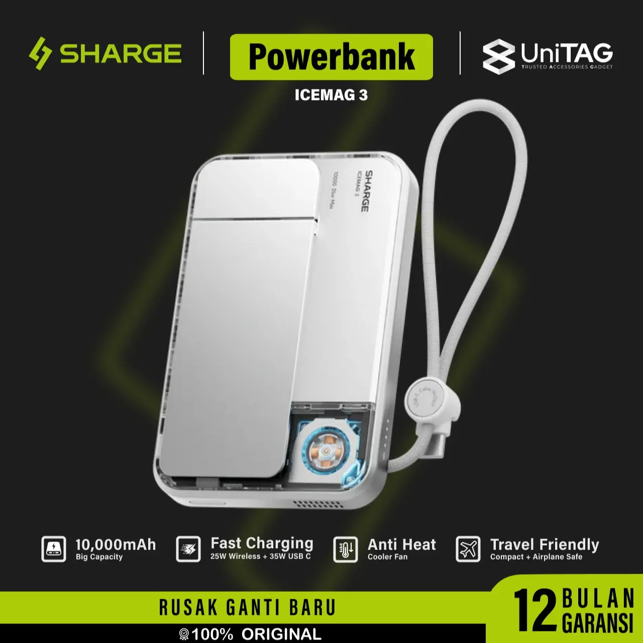Magnetic powerbank magsafe Sharge ICEMAG 3 terinspirasi dengan desain camera pocket yan elegan dan futuristik dilengkapi dengan baterai 10.000 Mah dilengkapi dengan fan cooler untuk mendinginkan powerbank serta kickstand sehingga membuat nyaman untuk aktivitas sambil mengisi daya, rasakan kenyamanan pengisian daya dimana saja, kapan saja !