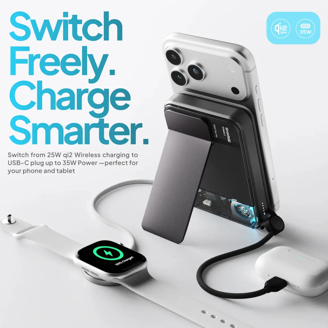 Terserifikasi qi2, pengisian wireless hingga 25W, serta pengisian daya baik device maupun powerbank 35W max, isi daya super cepat !