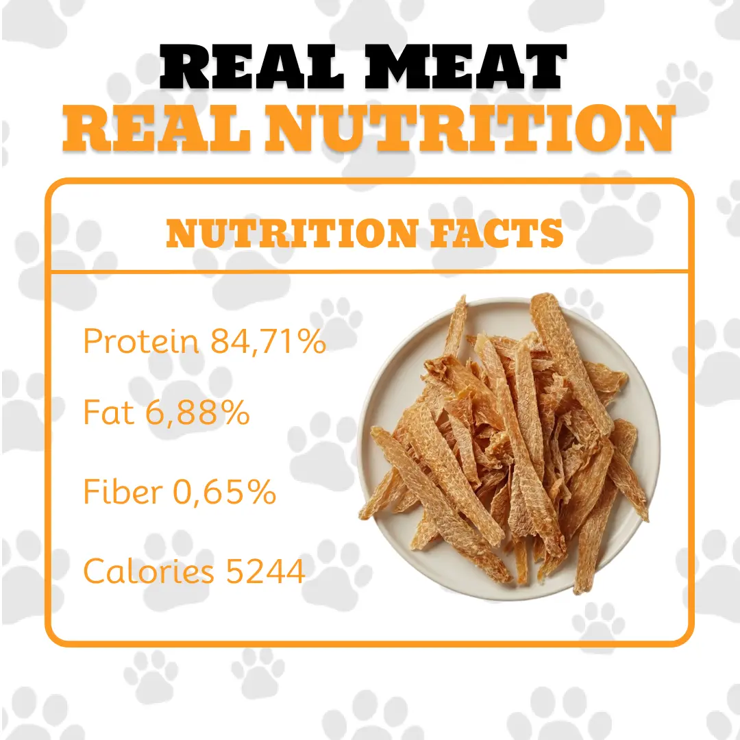 Tidak terlalu keras, tidak terlalu lembek—ideal untuk gigi anjing & kucing. Bisa digunakan sebagai camilan harian, training treats, atau reward setelah aktivitas. Netto: 50g.