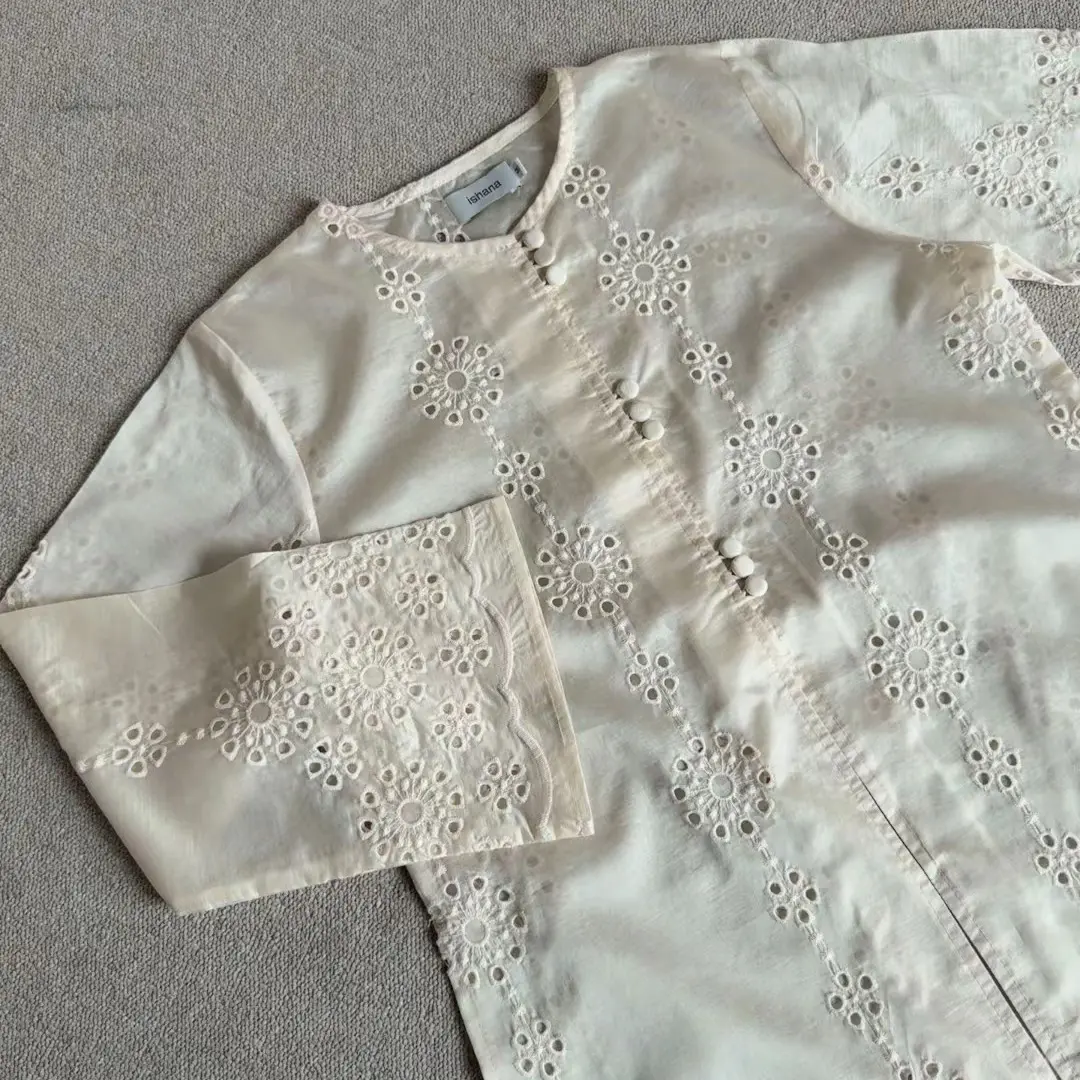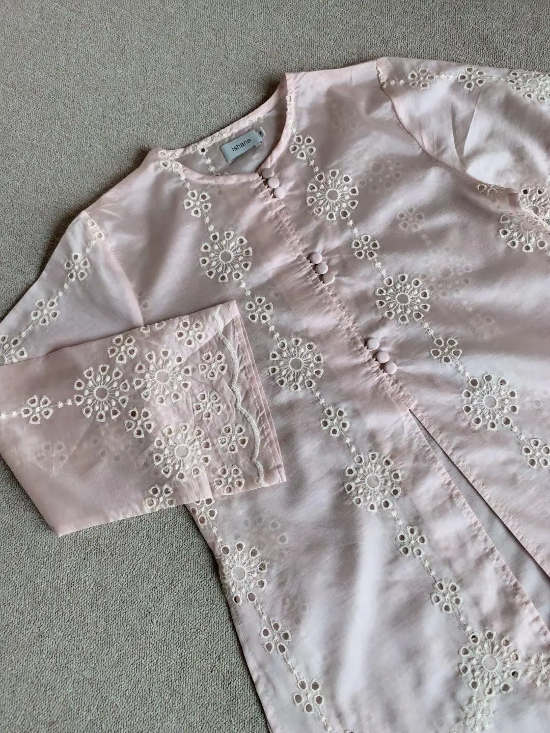 Kainnya sheer (sedikit menerawang) dengan efek shiny lembut khas serat alami, memberi tampilan lebih mewah dibanding kain polos. Dihiasi bordir bunga yang manis di seluruh permukaan kain.