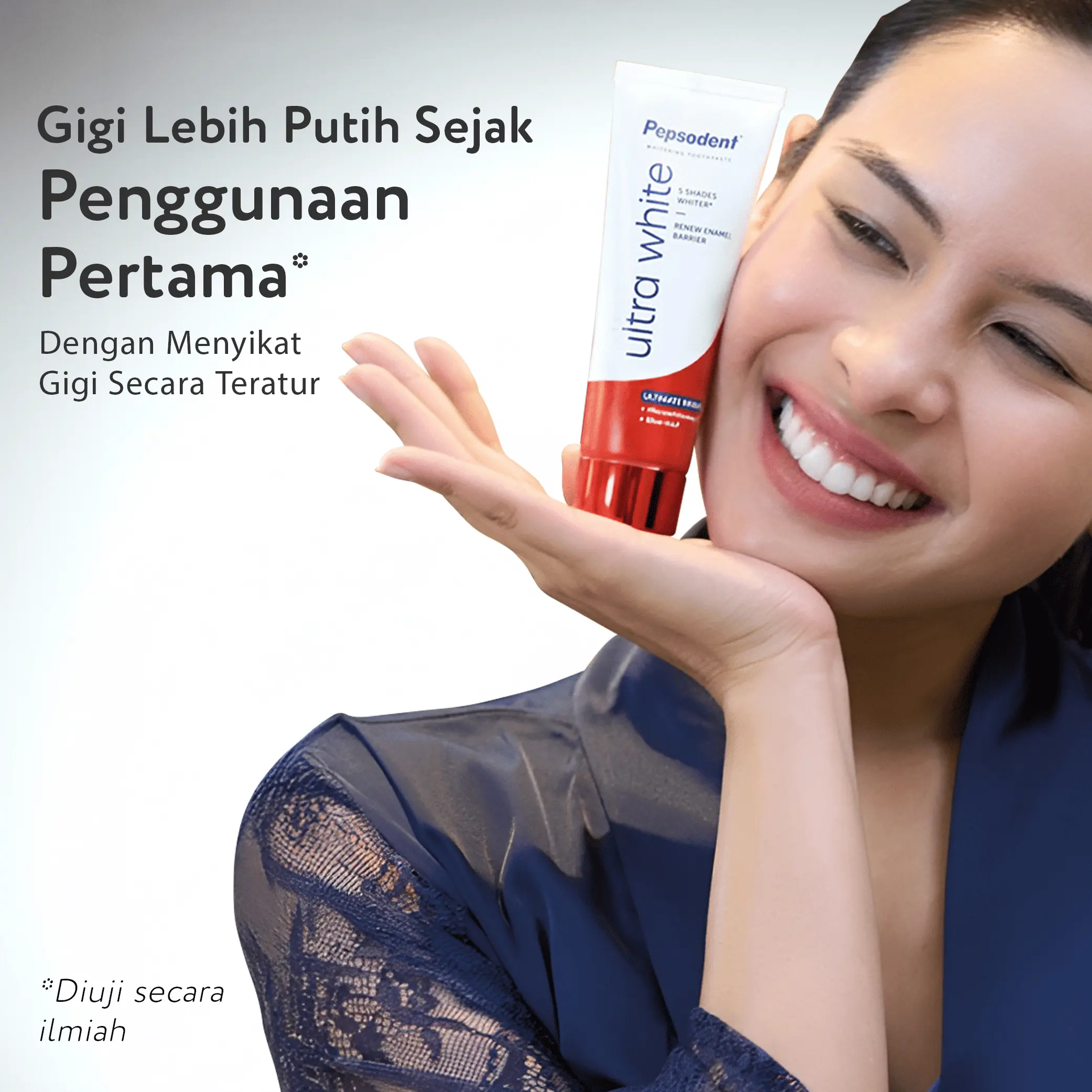 Senyum kamu butuh lebih dari sekadar pasta gigi pemutih. Pepsodent Ultra White Ultimate Bright Toothpaste hadir untuk gigi 5 tingkat lebih putih^ dalam 1 minggu & memperkuat kembali enamel barrier.