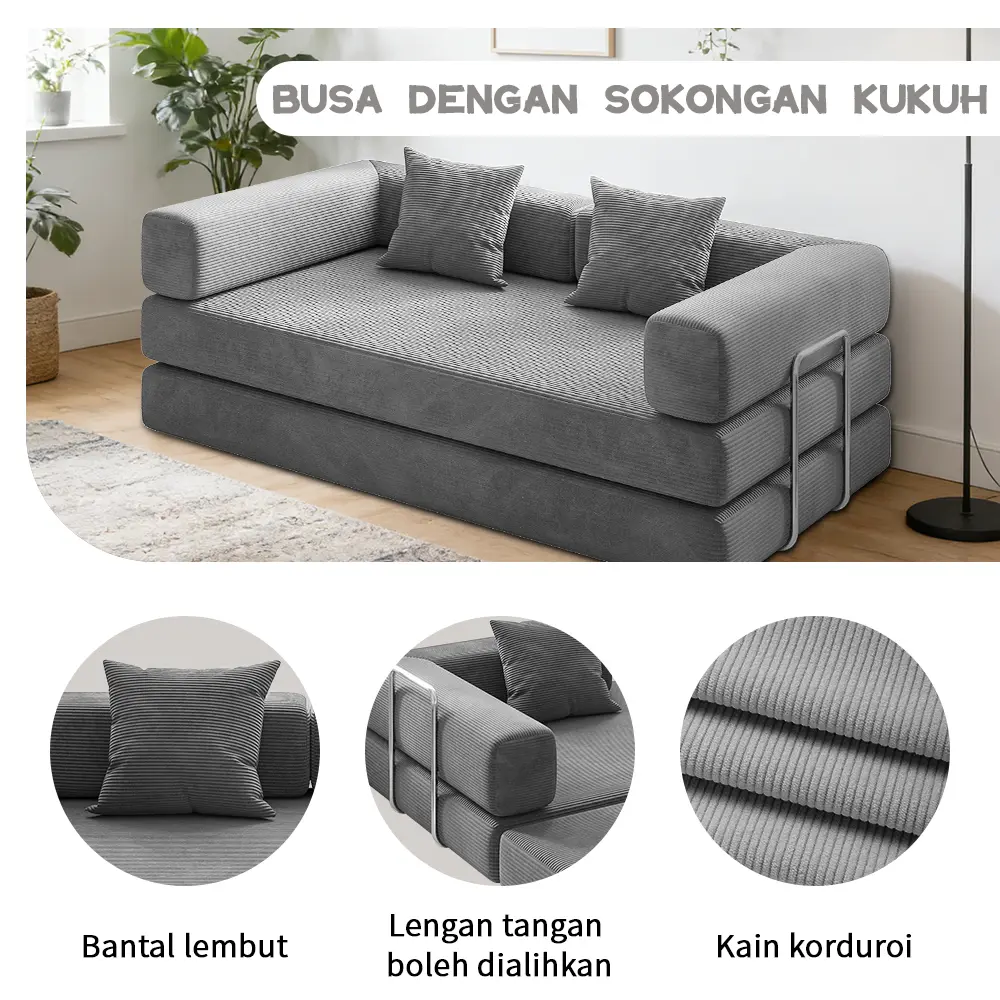 Suka banget sofa bed ini multifungsi ya ga nyesel beli nya busa nya kokoh spt nya awet ini sih bahan kain lembut sangat nyaman ..rekomend utk di beli jangan ragu deh.. pengiriman nya juga cepet .best ini sip