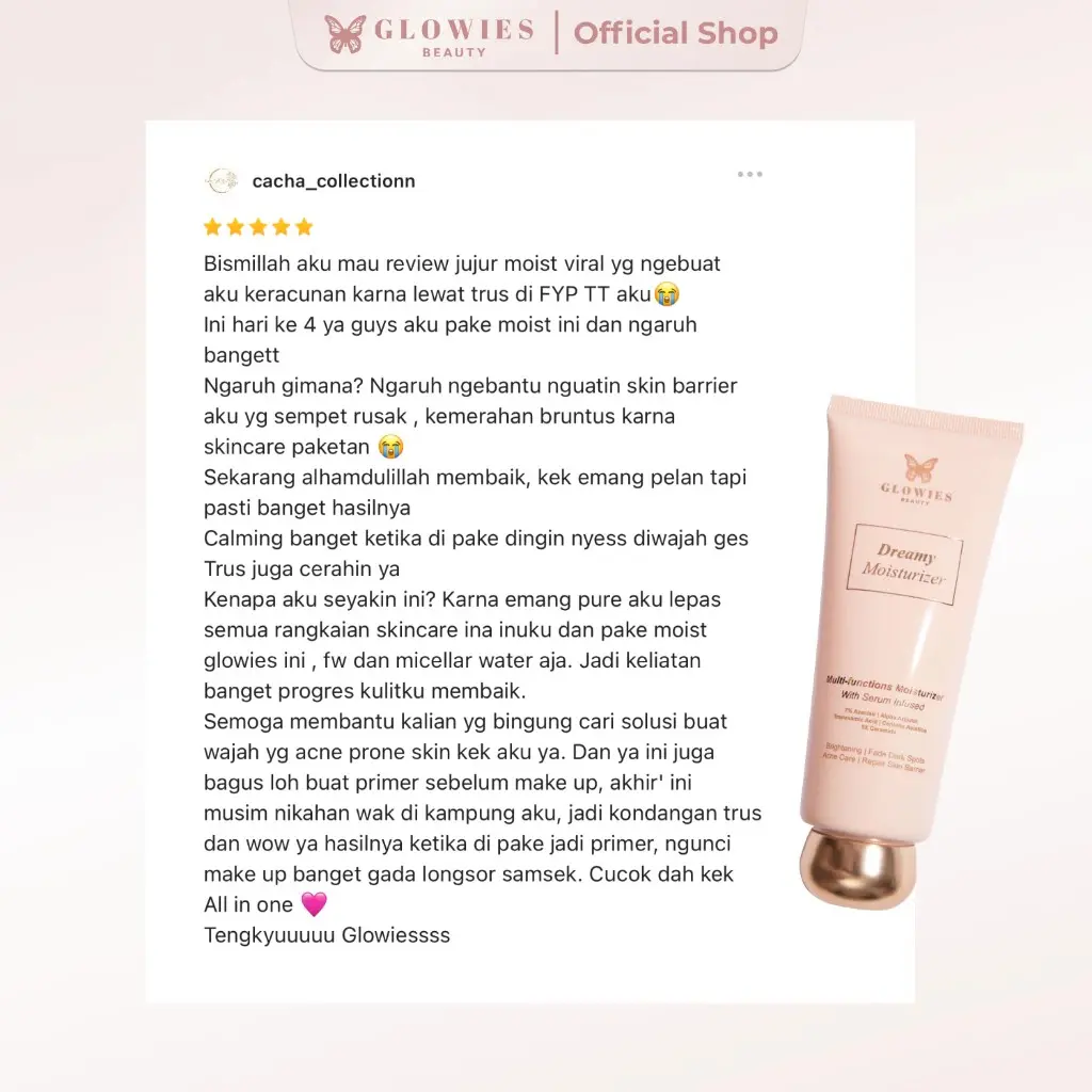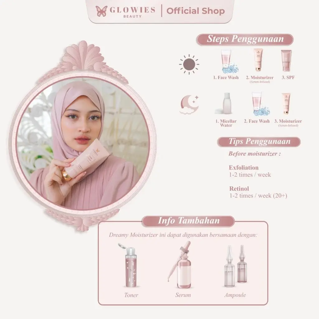 Jadikan Glowies Beauty Dreamy Moisturizer sahabat setia untuk kulit sehat bercahaya—cukup, simple, dan penuh percaya diri setiap hari!