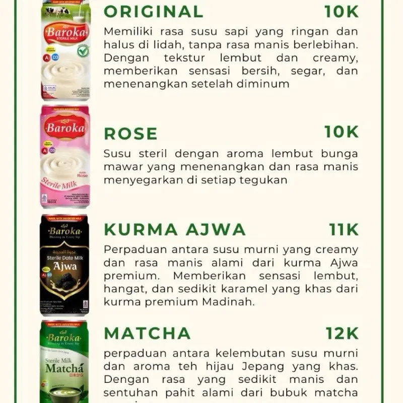 Susu Baroka original adalah susu steril yang sehat dan rasa manis pas. Rasakan
