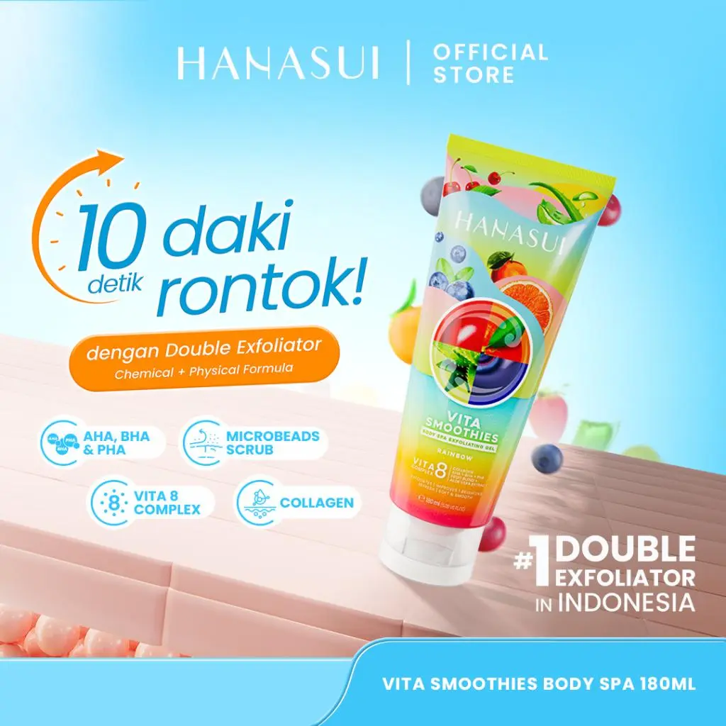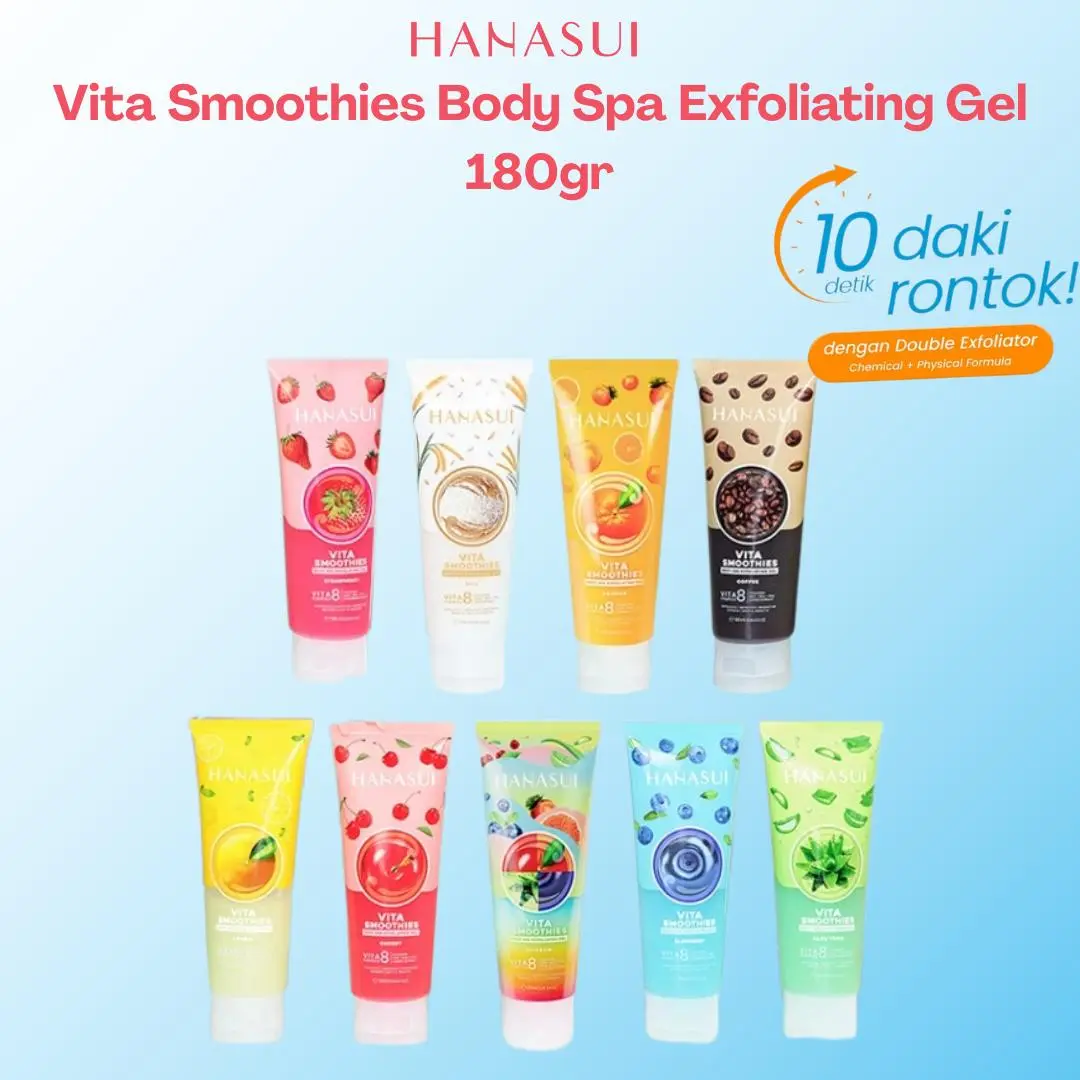Hanasui Vita Smoothies Body Spa Exfoliating Gel 10 DETIK DAKI RONTOK, menutrisi dan mencerahkan kulit. Hybrid exfoliator body spa gel dengan Vita 8 Complex, efektif mengangkat sel kulit mati dan melembapkan kulit secara mendalam. Cocok untuk kulit sensitif.