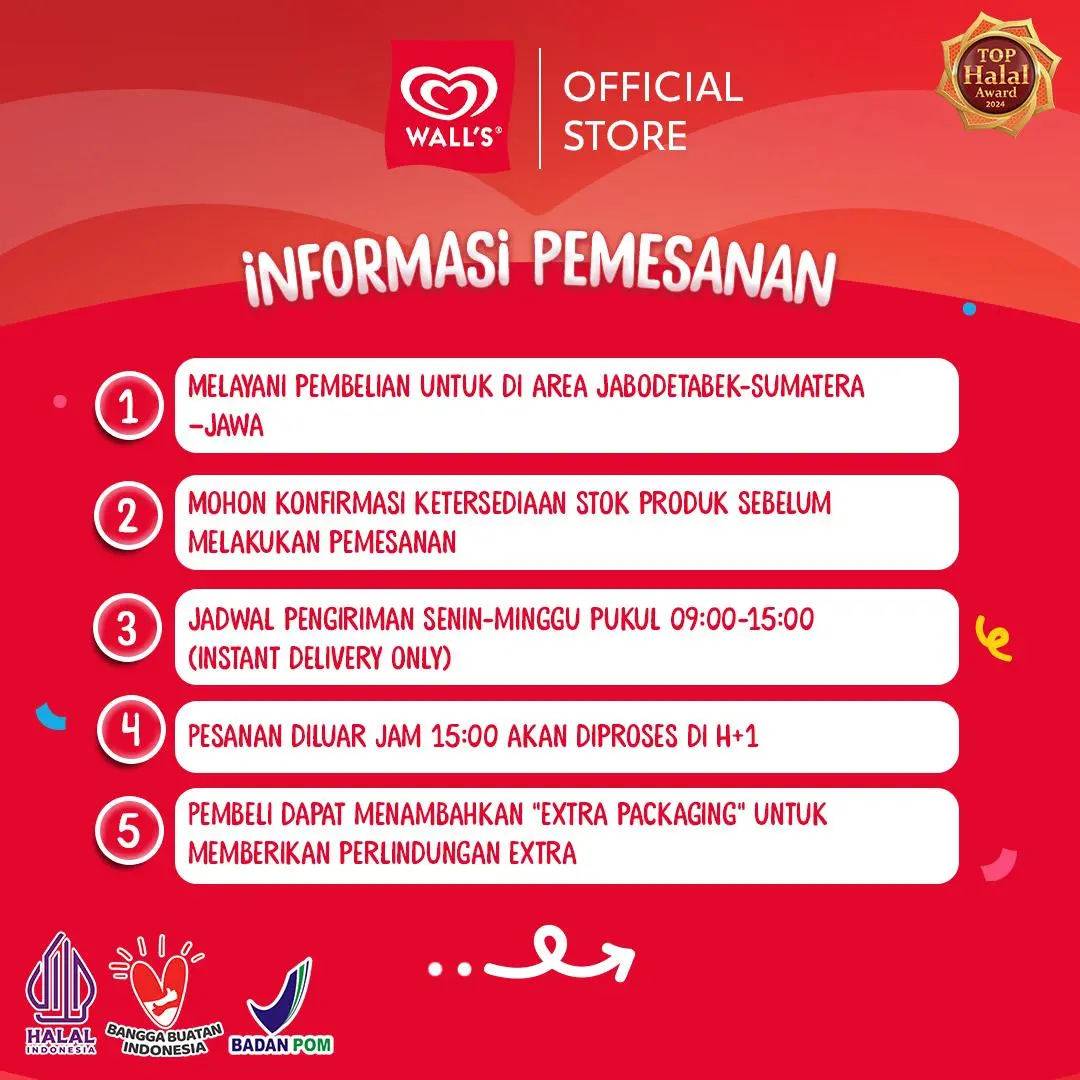 - Apabila stock es krim yang dipilih kosong, maka pihak Wall's berhak mengganti sesuai varian yang tersedia dengan harga yang sama