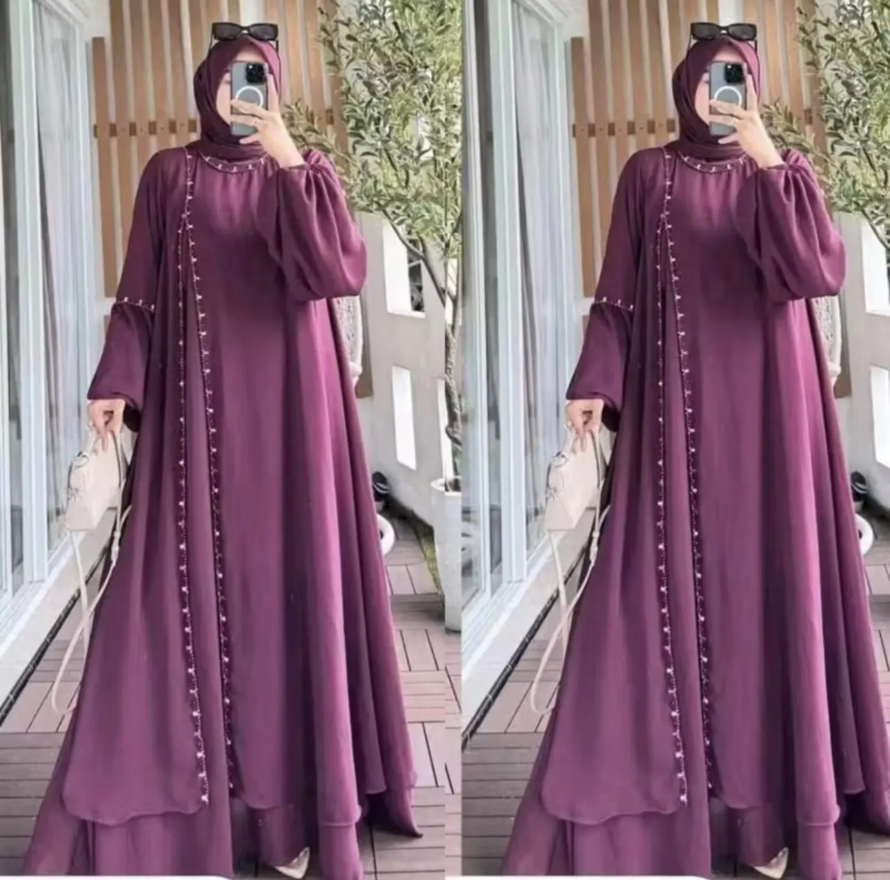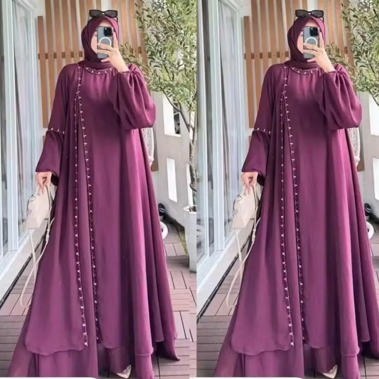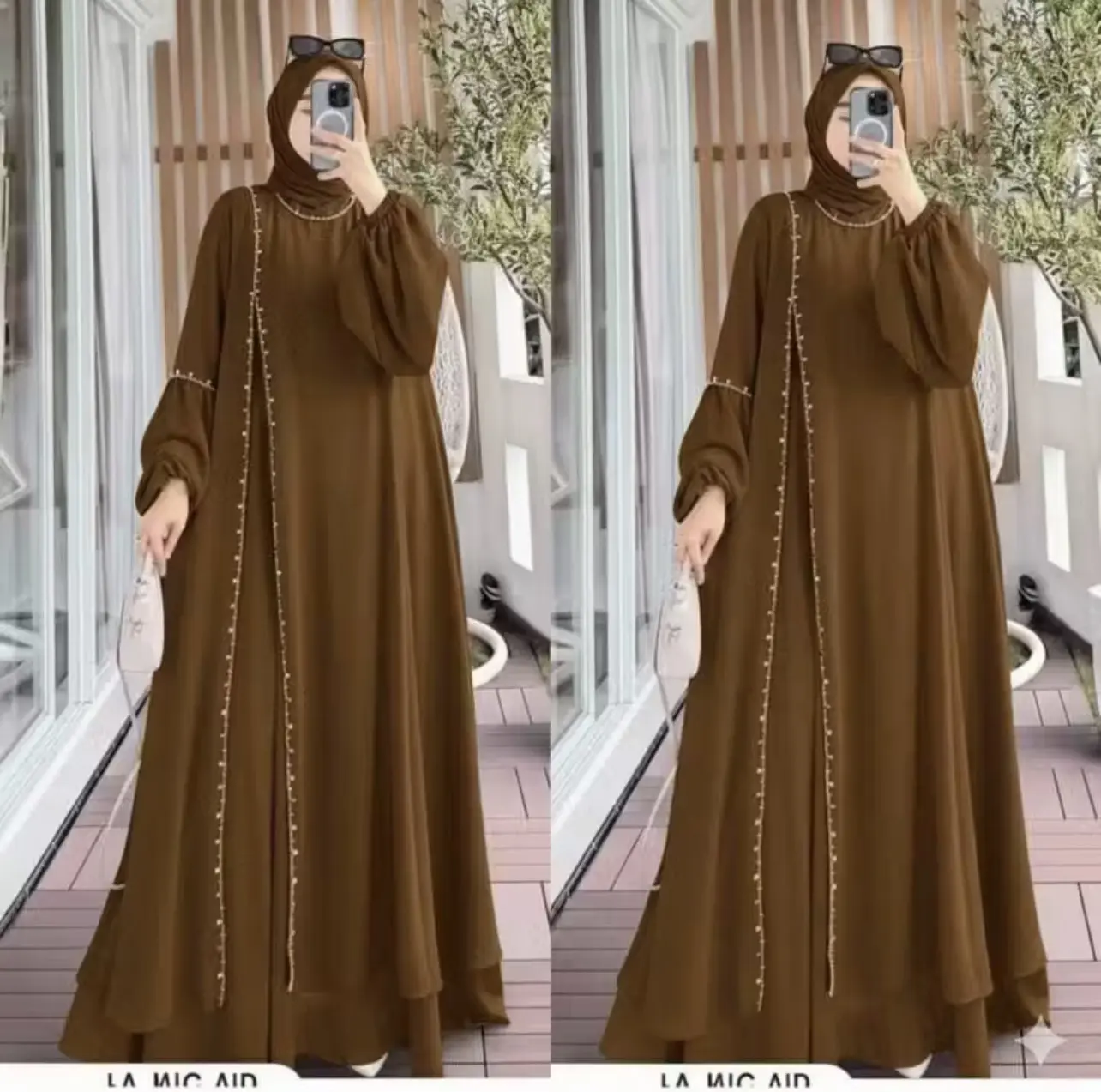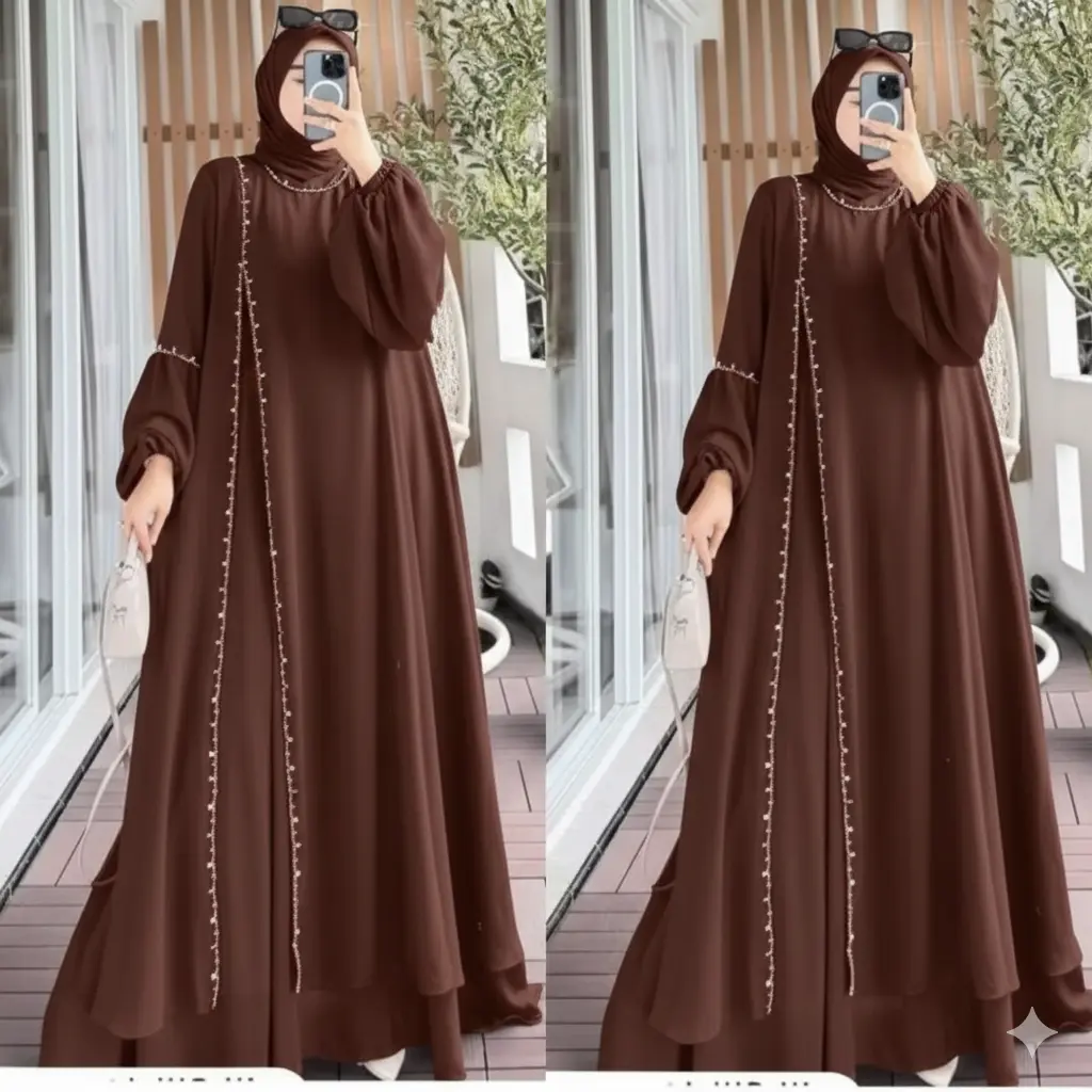 Gamis Aisyah 2026 Model Terbaru Abaya Turkey Warna Mahogany Dress Arab Saudi Payet Mutiara Layer Depan Wanita Mewah Elegan Bahan Ceruty Babydoll Size S-XXXL