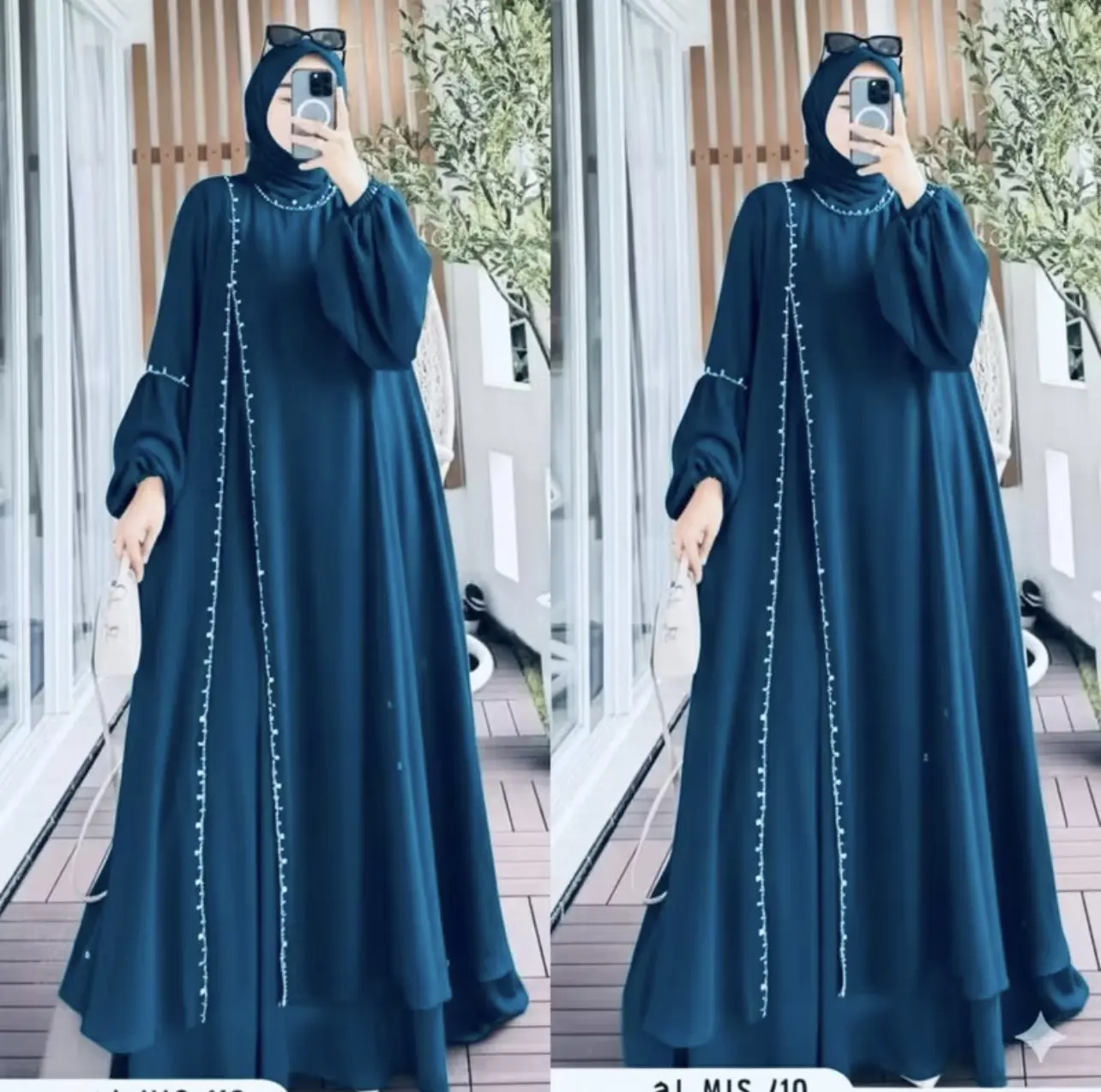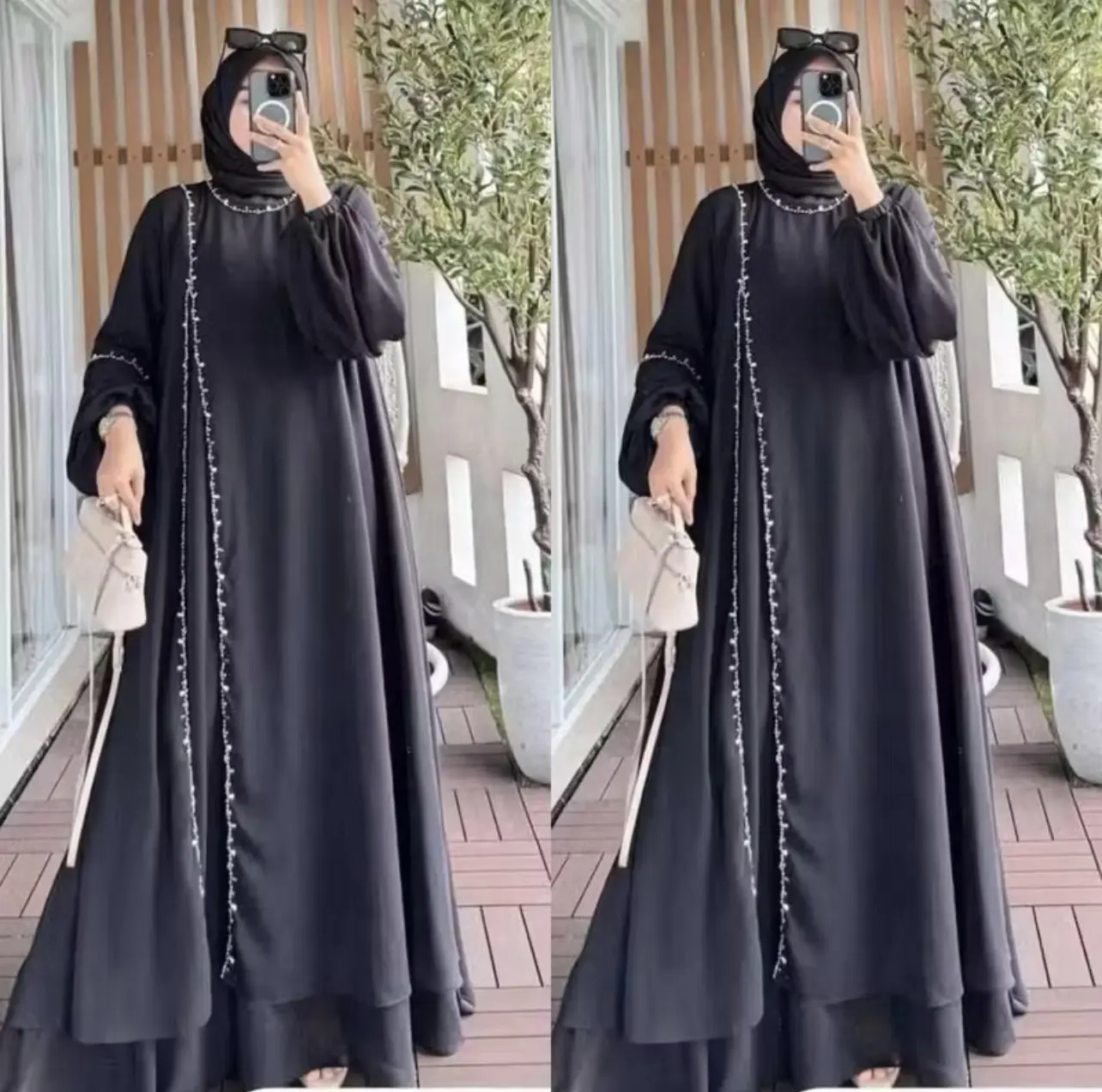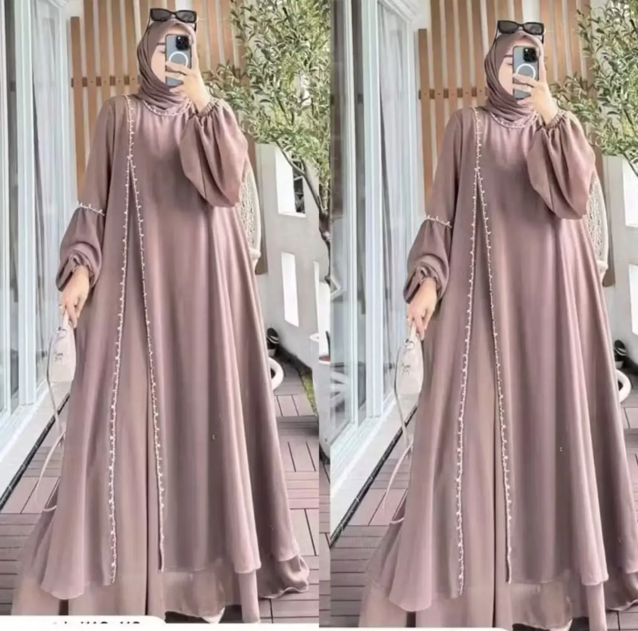 Gamis Aisyah 2026 Model Terbaru Abaya Turkey Warna Mahogany Dress Arab Saudi Payet Mutiara Layer Depan Wanita Mewah Elegan Bahan Ceruty Babydoll Size S-XXXL