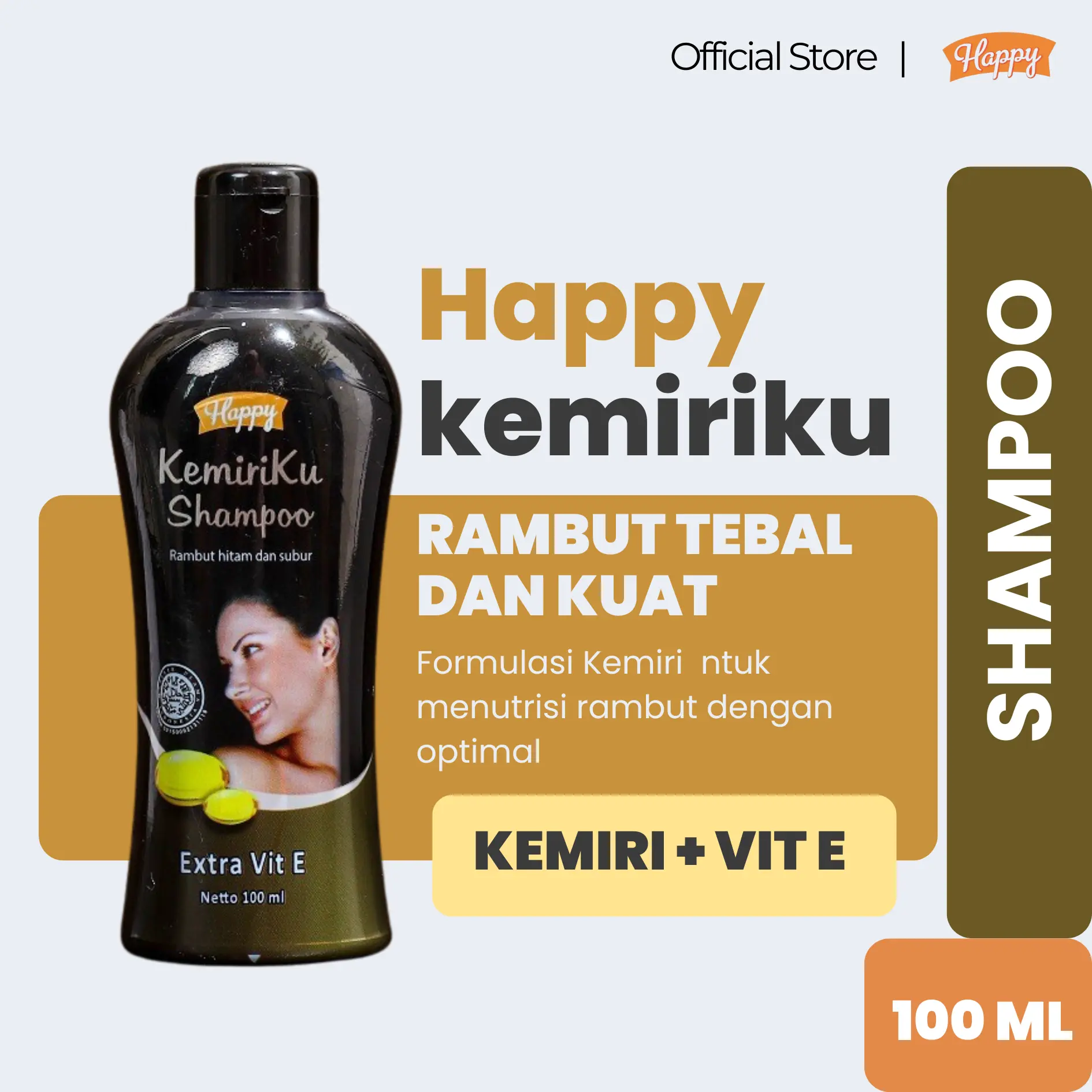 HAPPY KEMIRIKU SHAMPOO 100ml Mengandung vit. E minyak Kemiri asli yang kaya manfaat untuk perawatan rambut. Ditambah denga extra conditioner untuk melembutkan rambut cantik indahmu.
