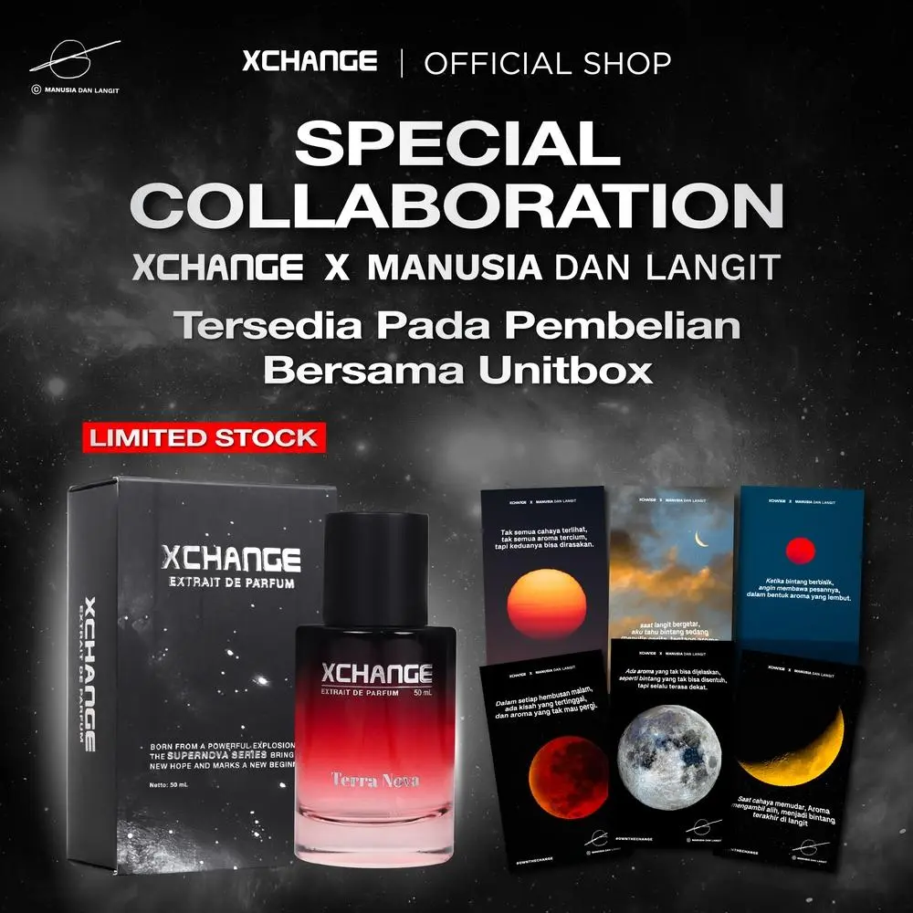 Terinspirasi dari sebuah ledakan fenomenal, XChange hadir memberikan aroma universe yang lahir perubahan. Kualitas Parfum kelas dunia, dikemas secara esklusif, premium & prestige dengan harga affordble namun High perceived value. Extrait de Perfume aroma Dengan ketahanan superior 13-18 jam, Jejak aroma yang di design untuk meninggalkan signature scent yang kuat dan ekslusif sehingga meninggalkan gravitasi aroma.