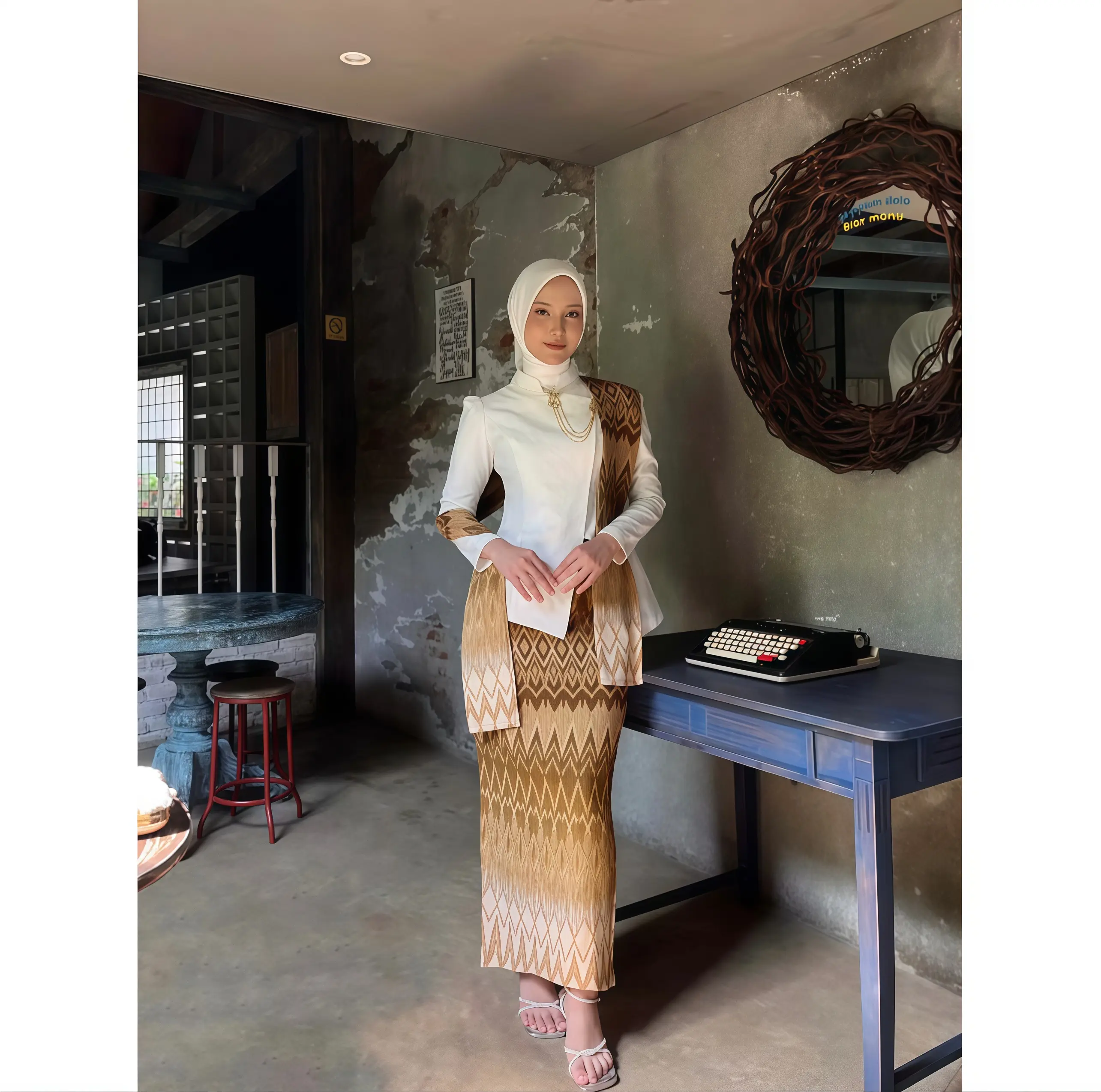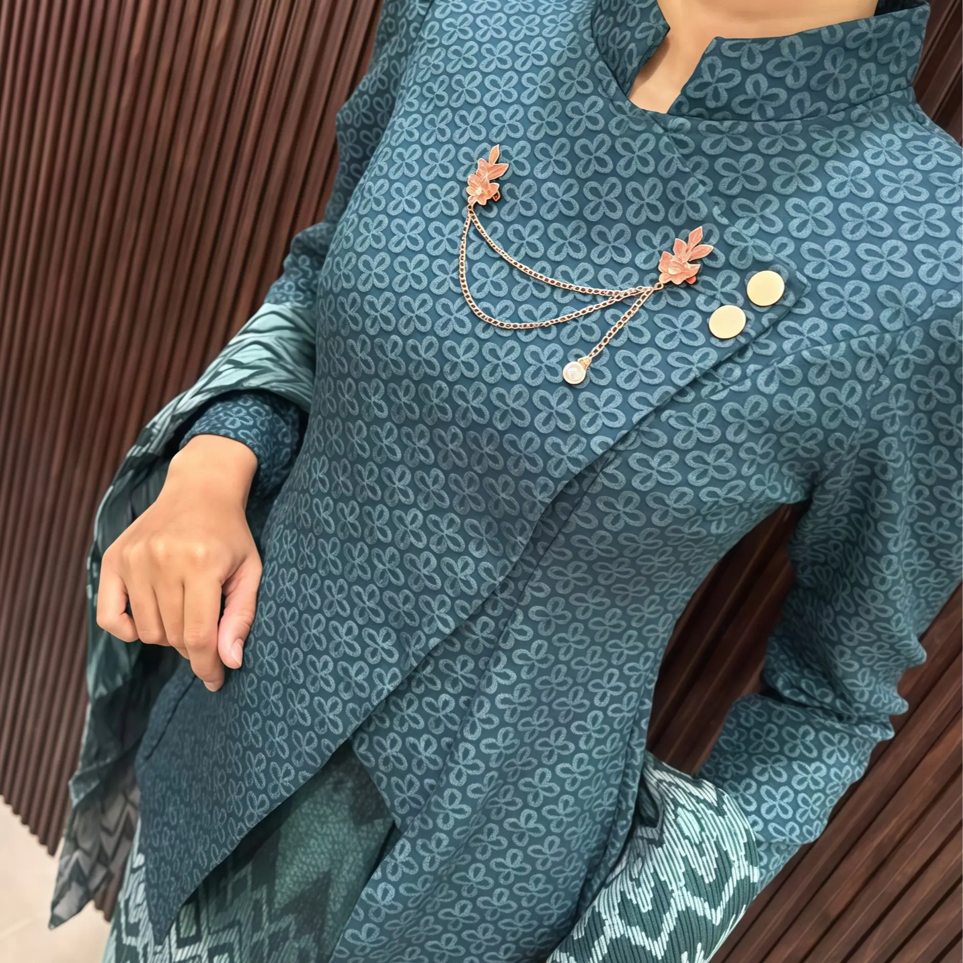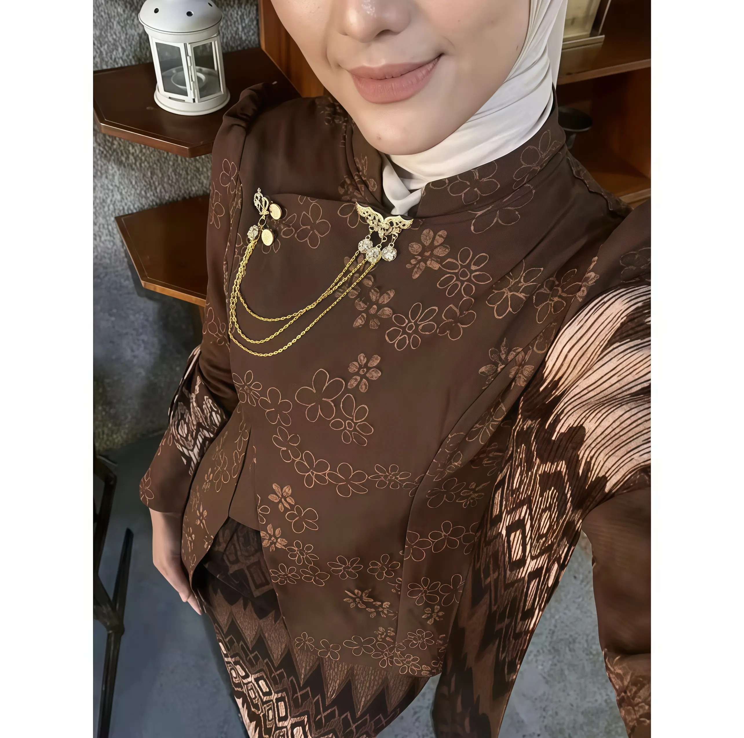 Sudah ada bross di bajunya. Warna rok dan selendang lebih tua