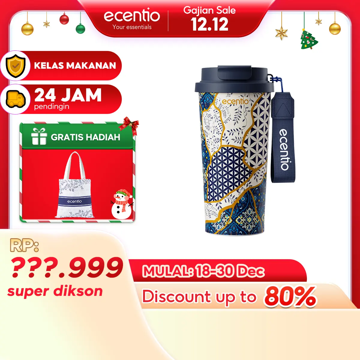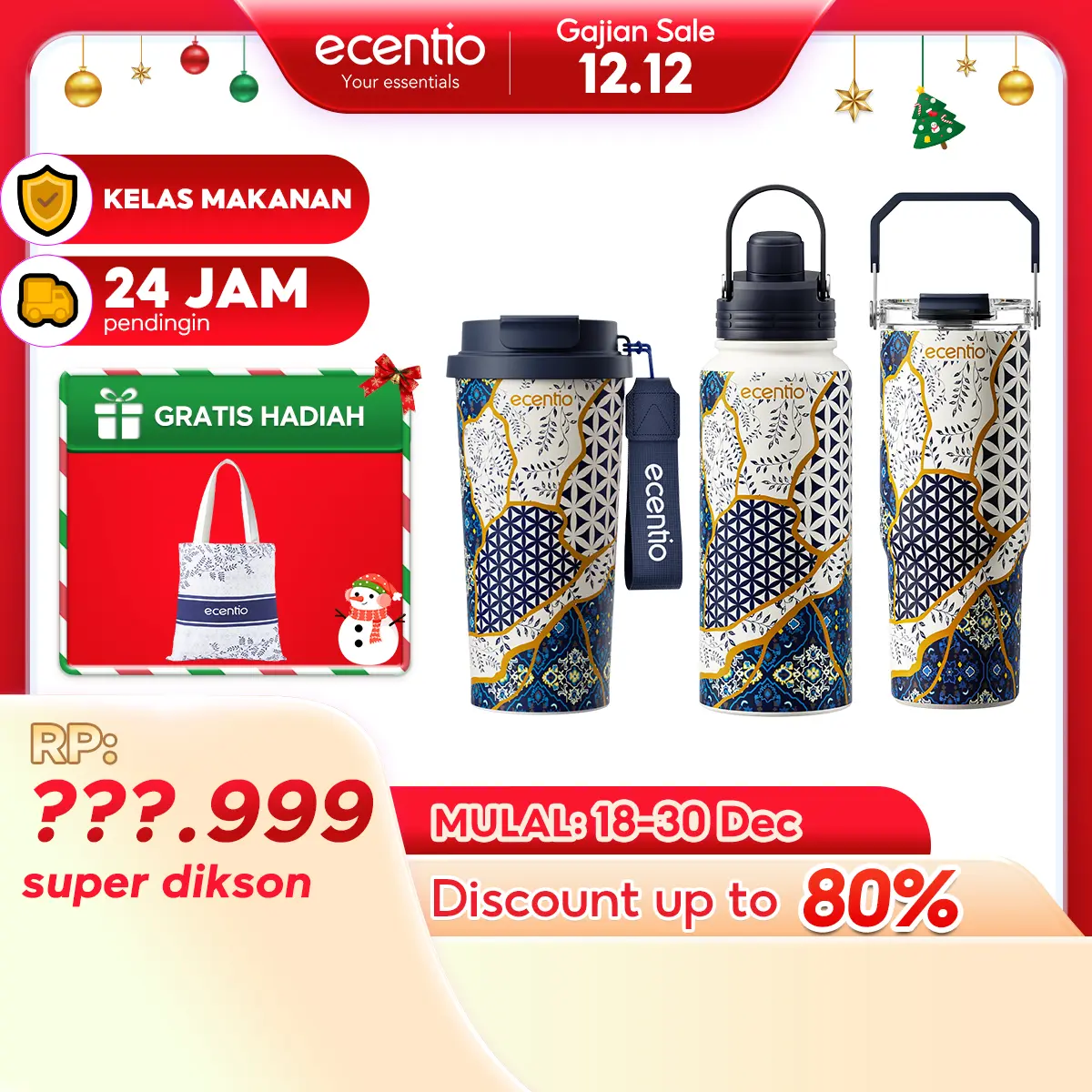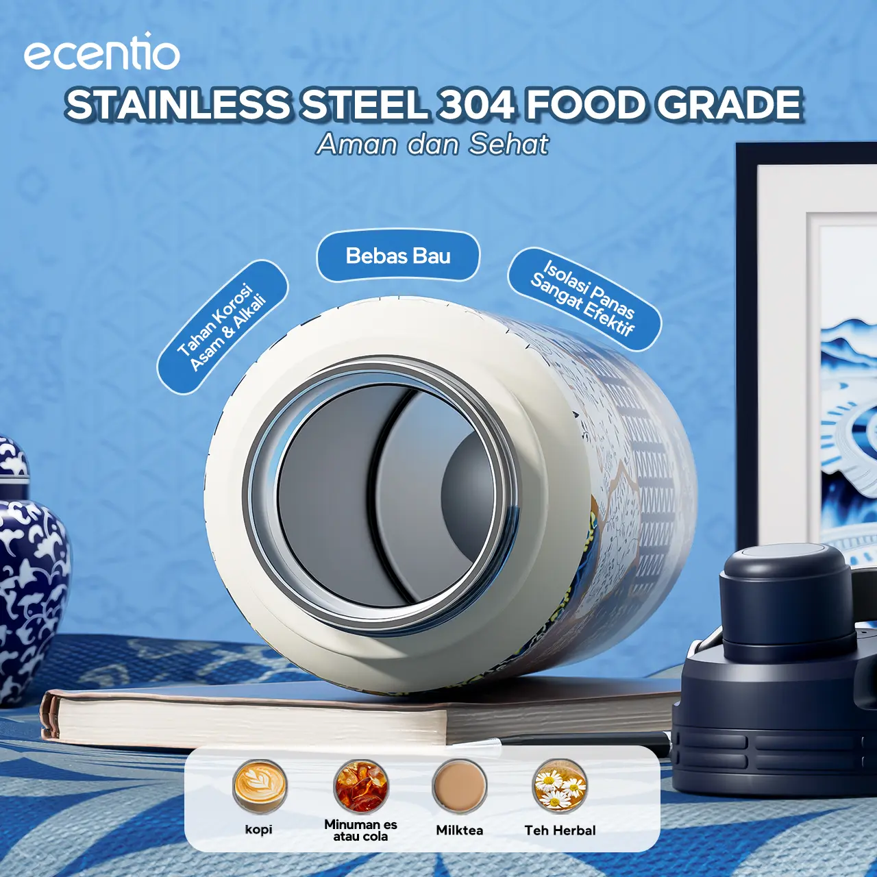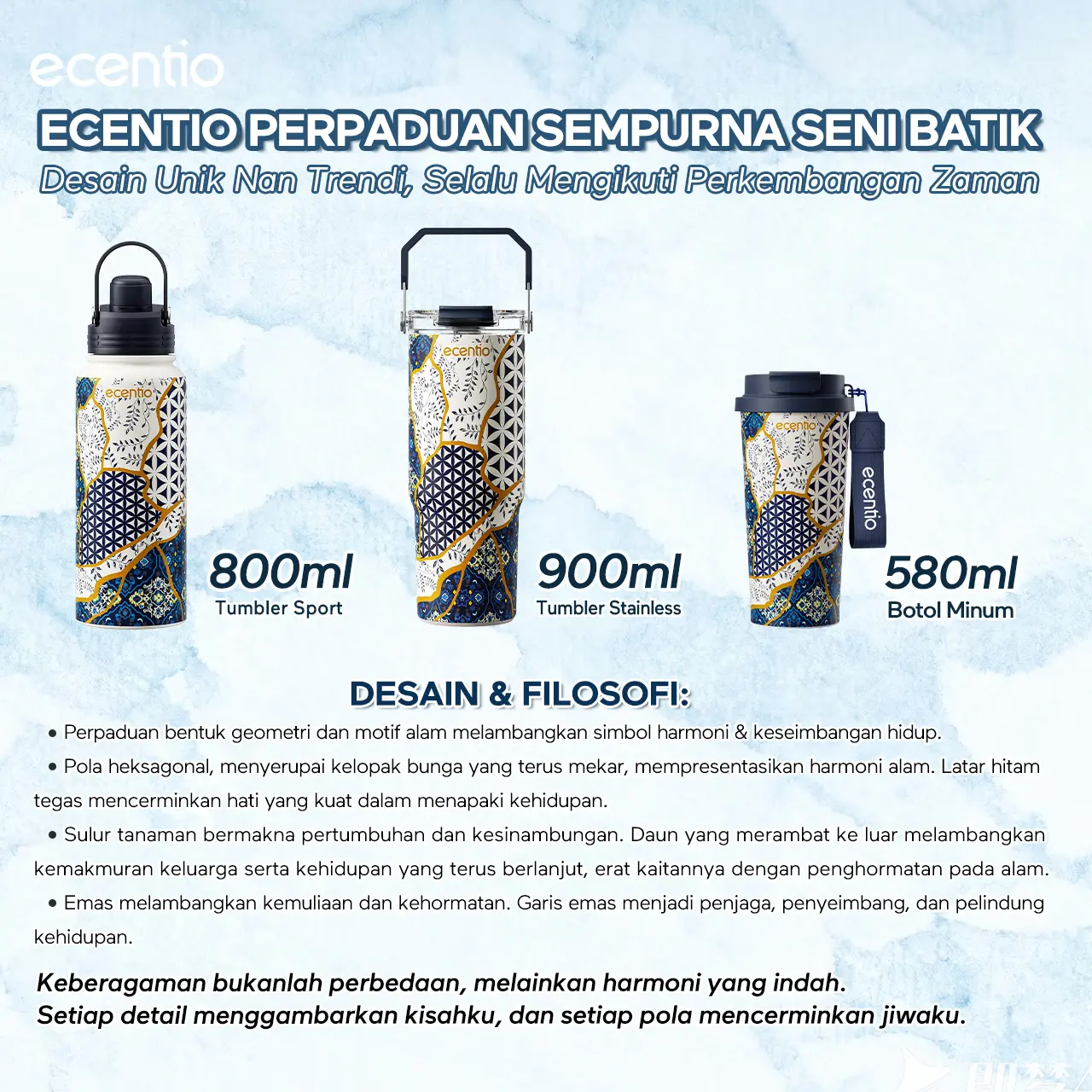 5. Ecentio Botol Minum 【live】Batik Aesthetic 580ml/800ml/900ml 【Stainless steel】【Plastic】Magnetic cover Vacuum Flasks- Tahan Panas & Dingin, Food Grade, Desain Modern Warisan Budava BPA free