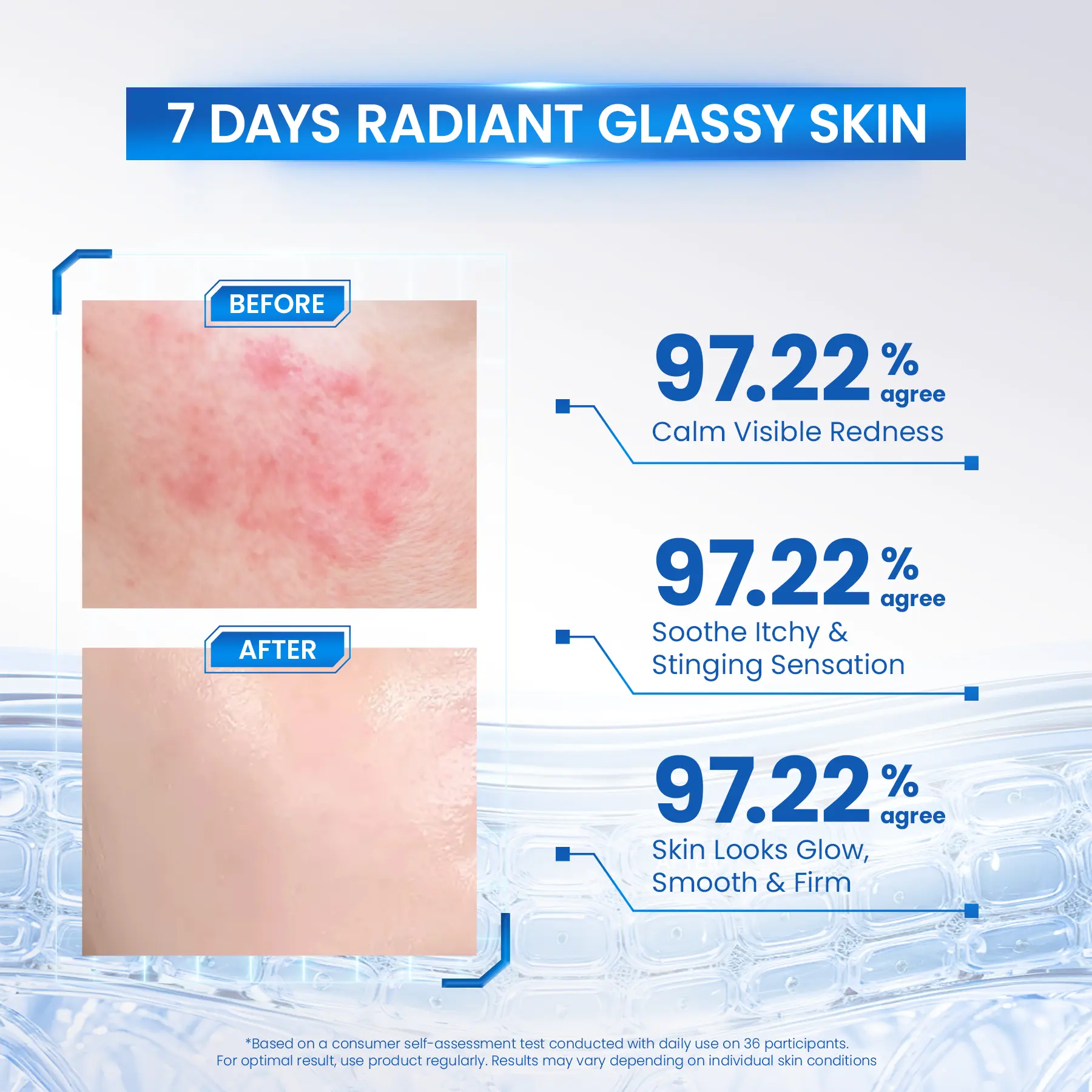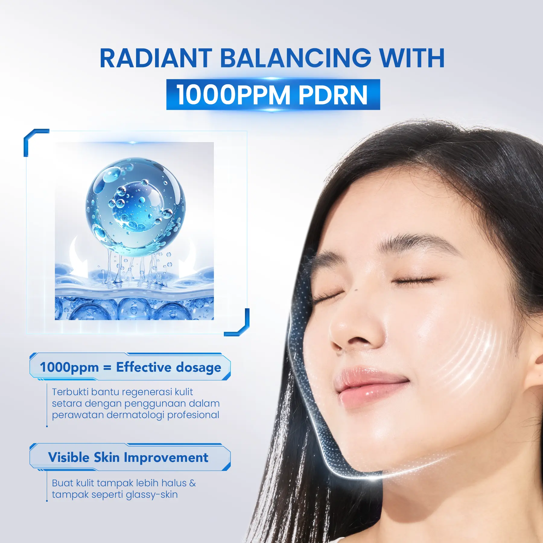 Serum dengan 1000ppm PDRN yang membantu menenangkan kemerahan, memperkuat barrier, serta formula Skin Elasticity & Wrinkle Care Complex untuk menjaga kekenyalan kulit agar tampak lebih halus dan sehat ala glass skin. Dalam 7 hari*, 97,22% pengguna merasakan berkurangnya kemerahan serta sensasi perih dan gatal pada kulit.