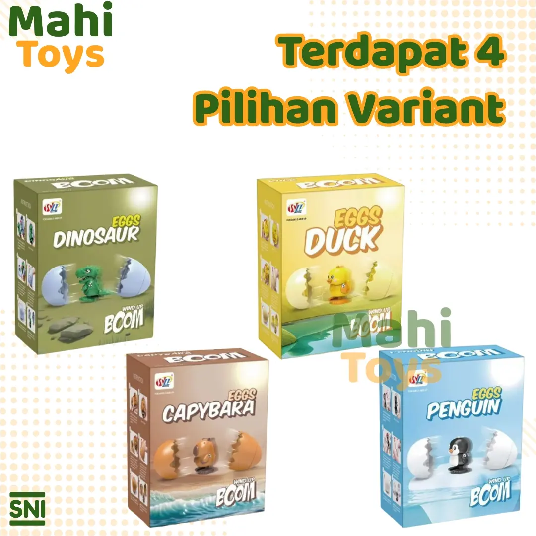 Mainan Egg Boom Series adalah mainan lucu berbentuk telur yang dapat terbuka otomatis dan mengeluarkan karakter hewan menggemaskan seperti Capybara, Bebek (Duck), Dinosaurus, dan Penguin. Setelah telur terbuka, karakter di dalamnya akan keluar dan berjalan sendiri berkat mekanisme wind-up tanpa baterai.