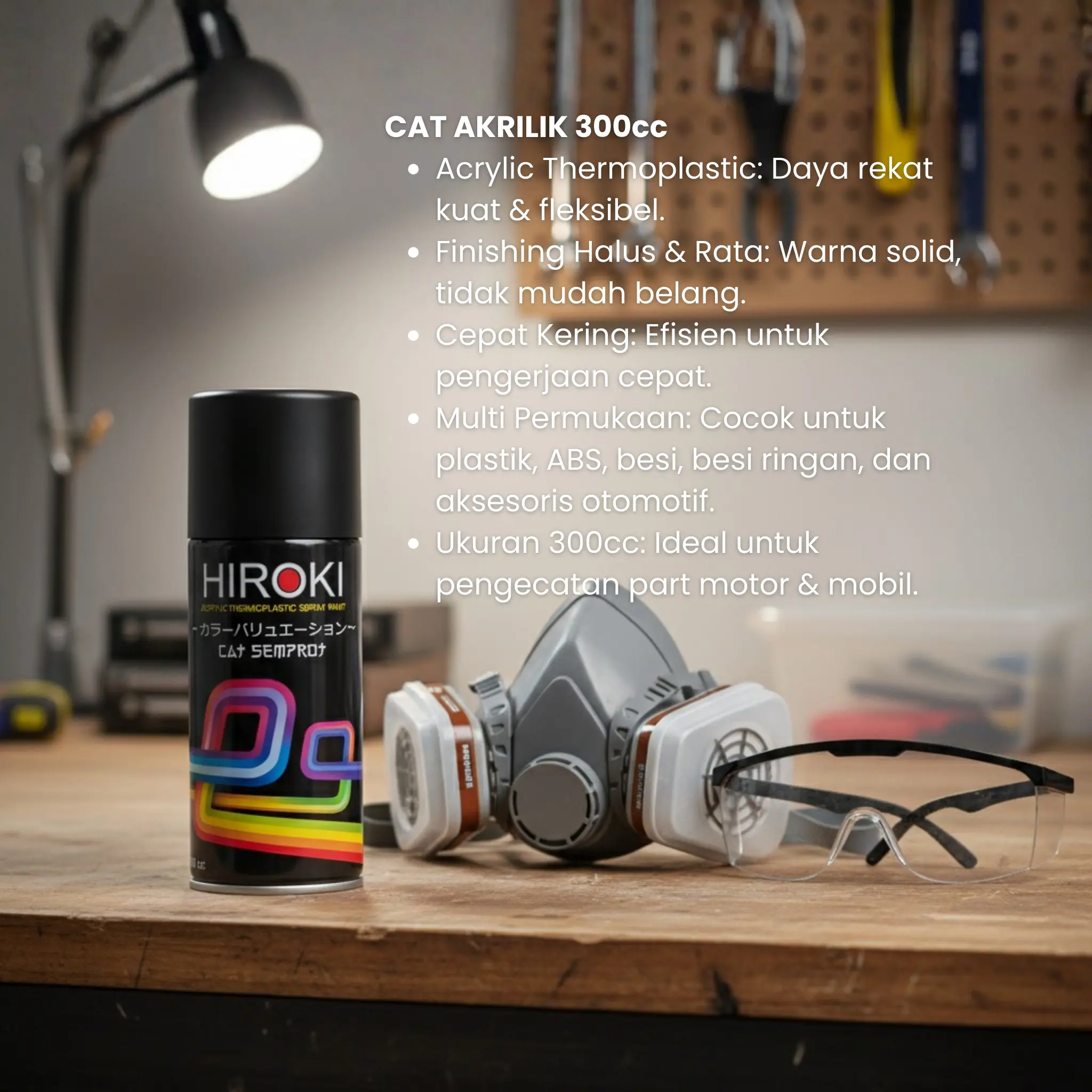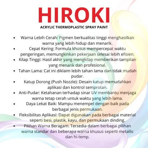 Hiroki adalah cat semprot yang diformulasikan khusus dengan campuran bahan kimia sehingga tahan terhadap siar ultra violet dan memiliki warna yang lebih cerah, lebih cepat kering, lebih mengkilap, daya rekat yang baik cocok digunakan untuk interior maupun eksterior