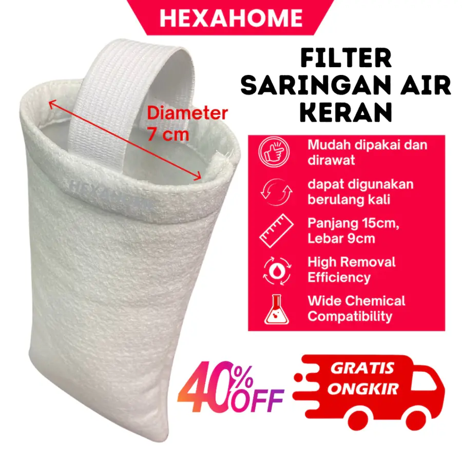 Filter ini cocok untuk berbagai jenis air seperti PDAM, Sumur Bor, WTP, dan lainnya. Tebal dan kualitas bagus, filter ini mudah digunakan. Saringan air jernih, berkarat, atau berpasir dapat disaring dengan filter ini. Bahan kain yang tebal membuatnya efektif dan dapat dicuci.