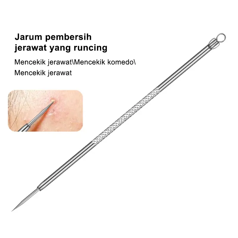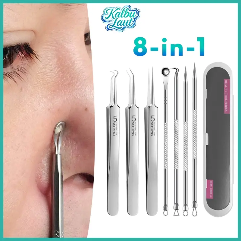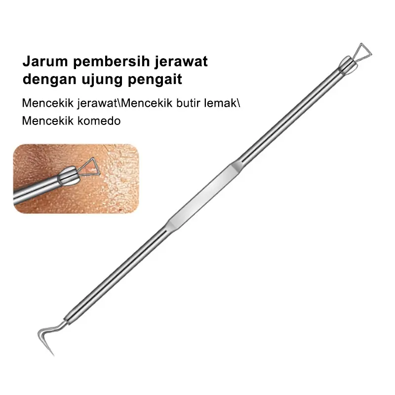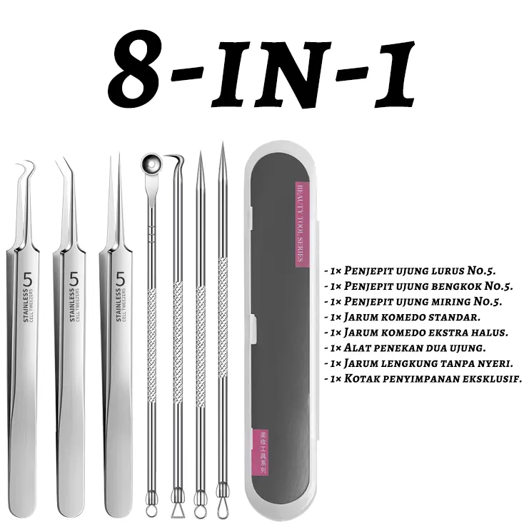 - 8 Perlengkapan Spesialis: Berbagai alat untuk ekstraksi komedo di area datar, sudut hidung, dan spot sulit terjangkau, dilengkapi jarum khusus dan alat tekanan.