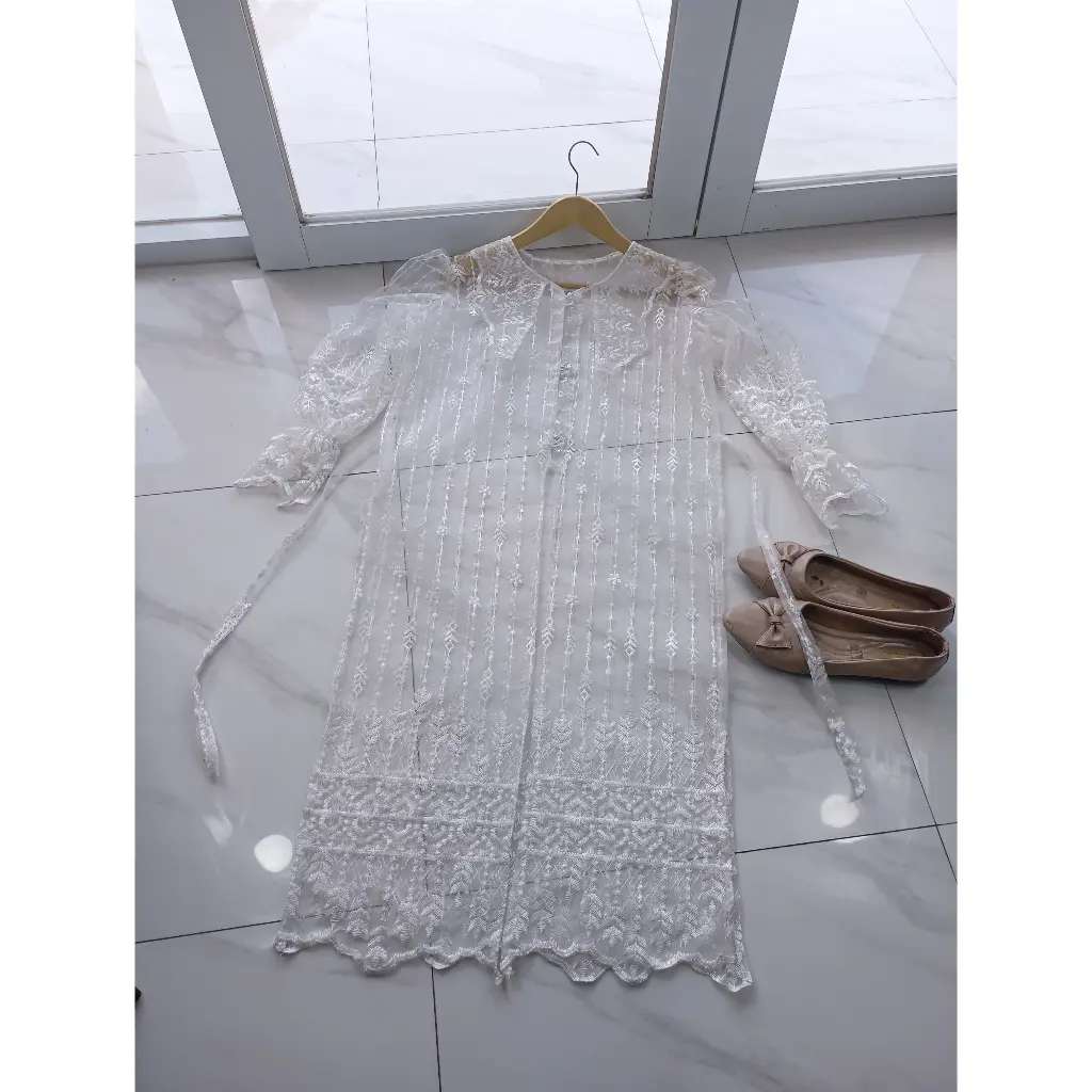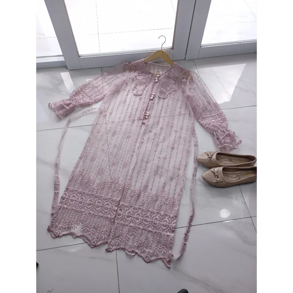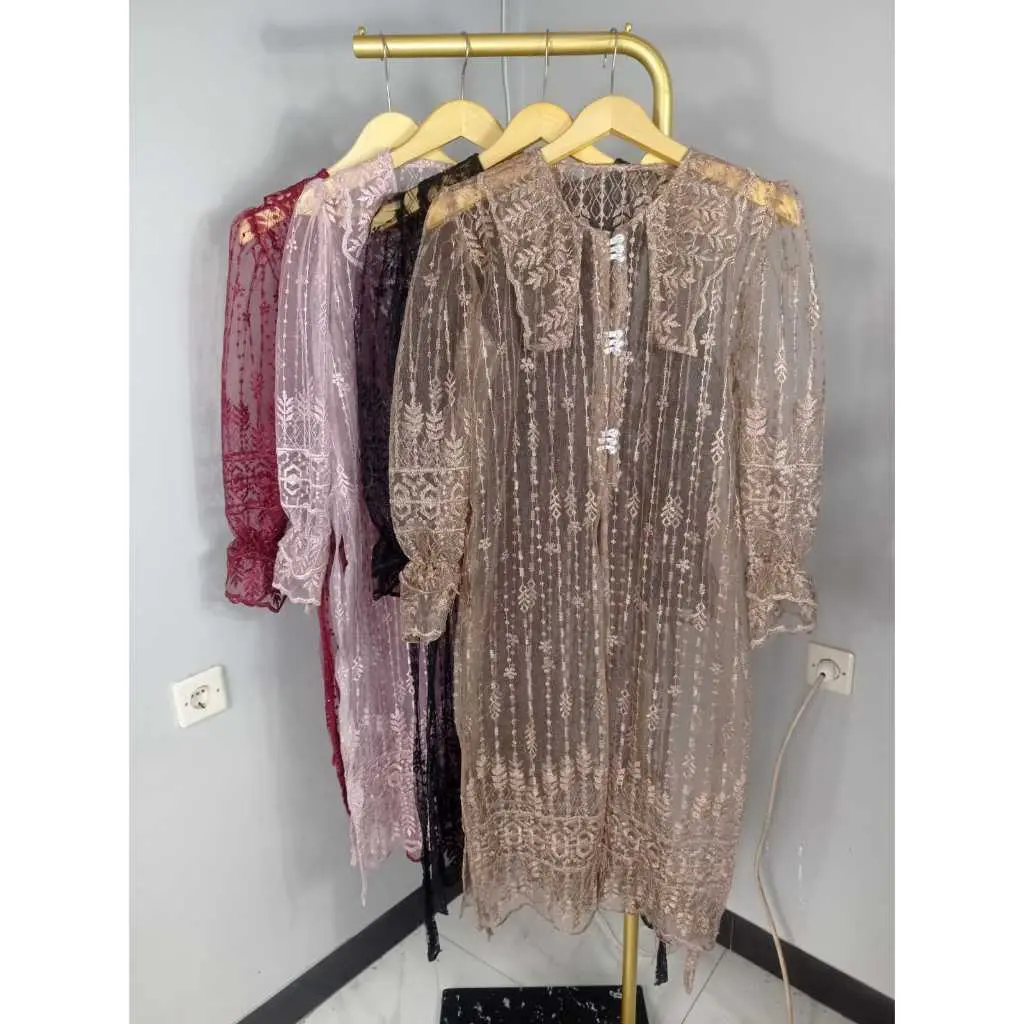 SIZE CHART - Panjang outer +- 100 cm - Panjang lengan +- 60 cm - All size LD 110 cm READY STOCK FEATURES: - Model simpel tapi manis dengan kombinasi tille ethnic & kancing premium - Kancing premium di bagian depan yang menambah kesan elegan dan mewah - Motif sesuai & sama persis yang ada di etalase produk