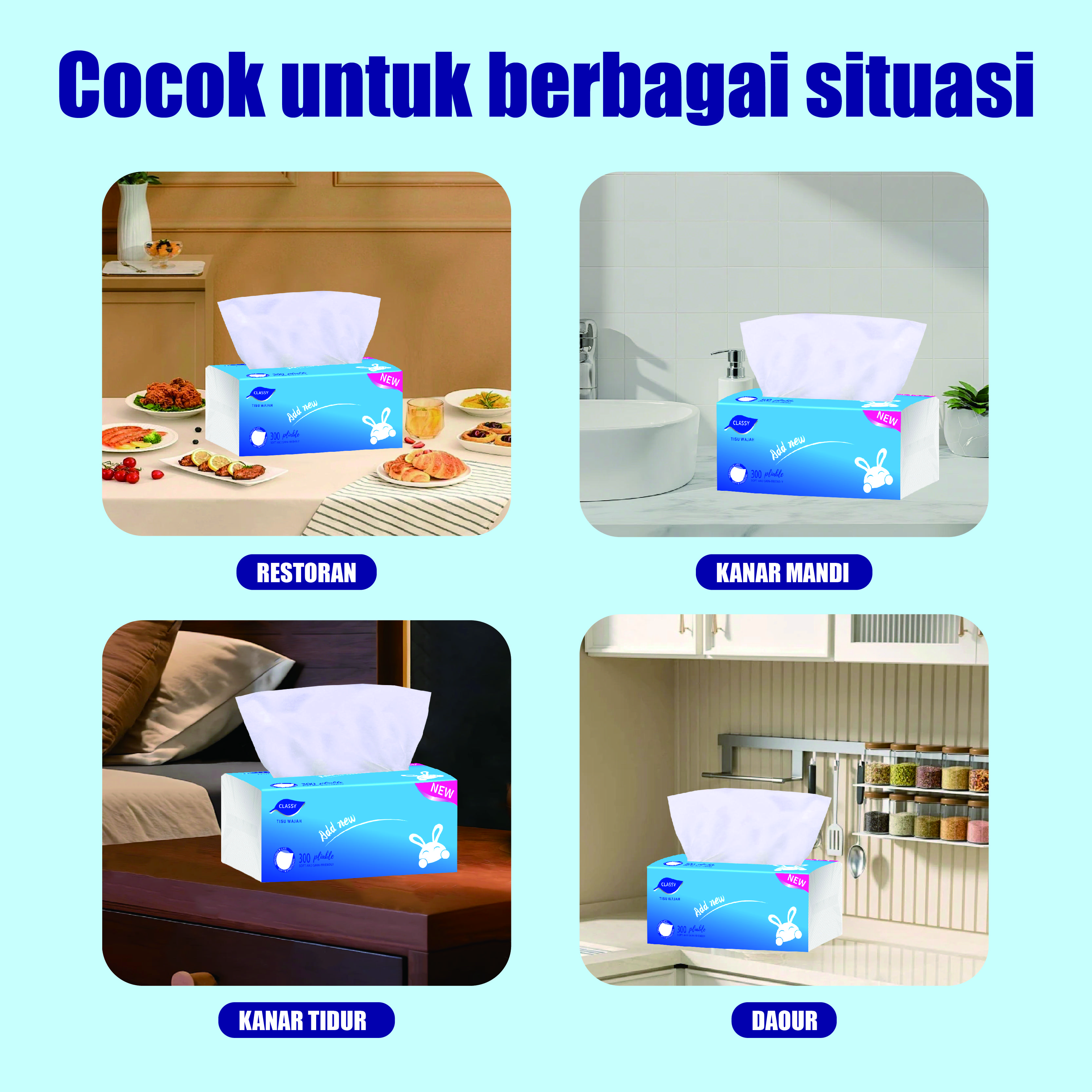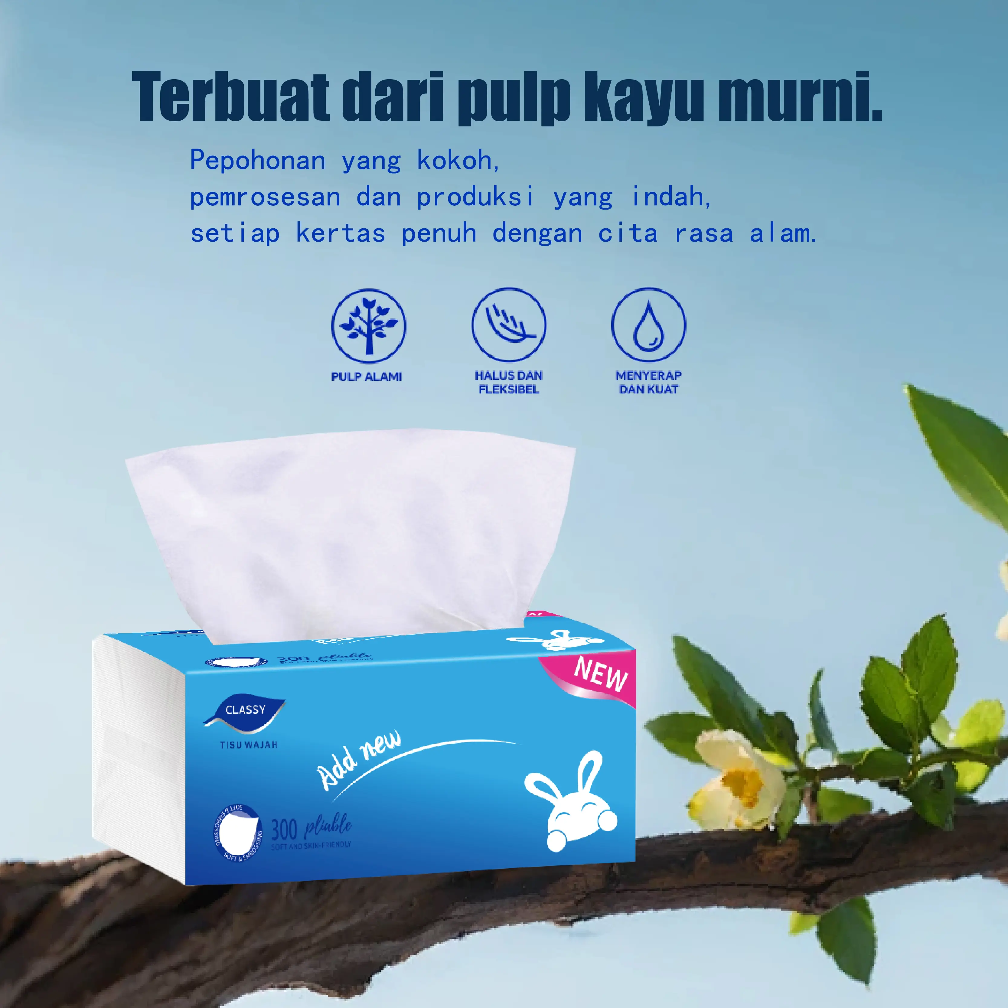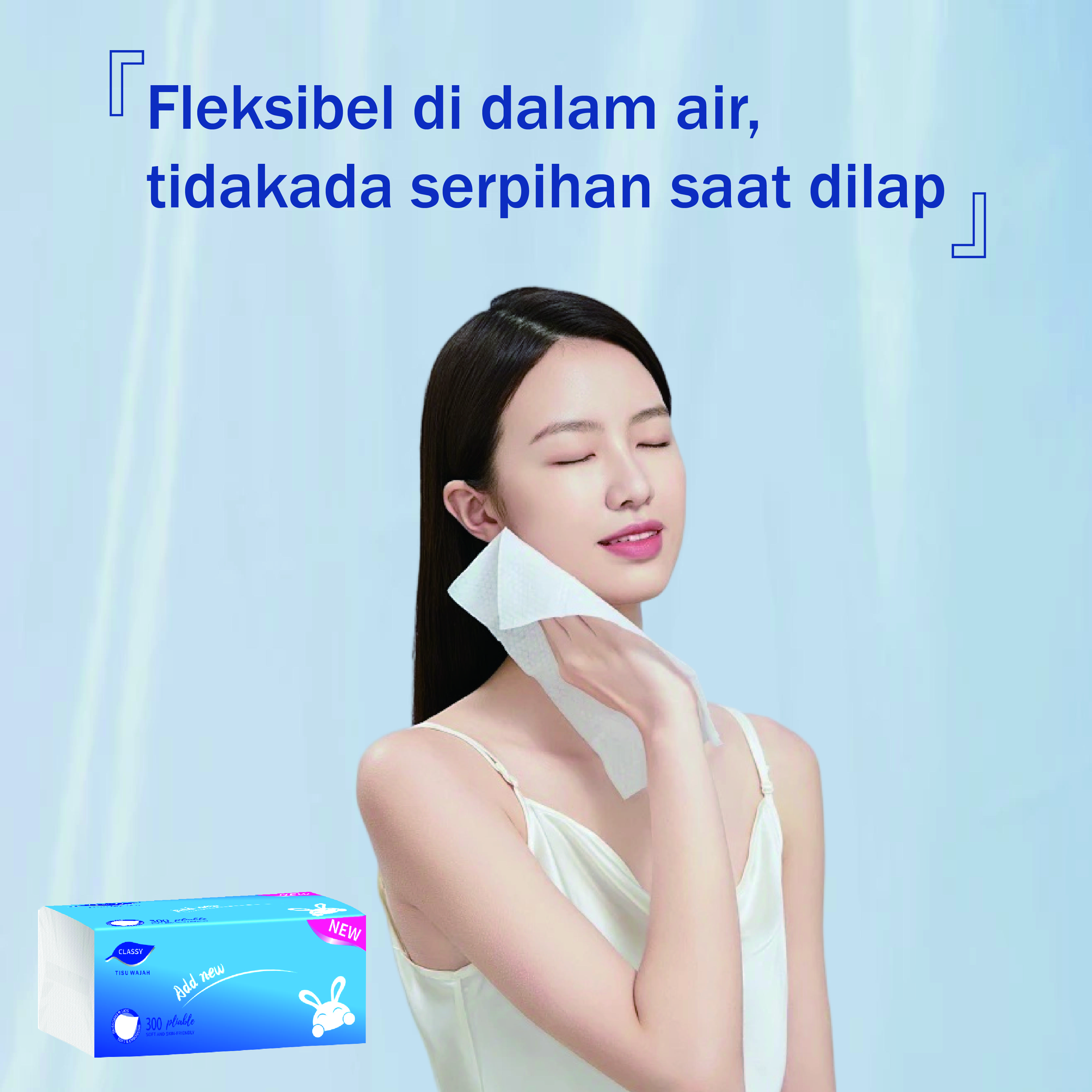 Kemasan baru CLASSY tissue wajah terbuat dari 100% serat alami. Diproses secara higienis, menghasilkan tisu halus berkualitas tinggi.