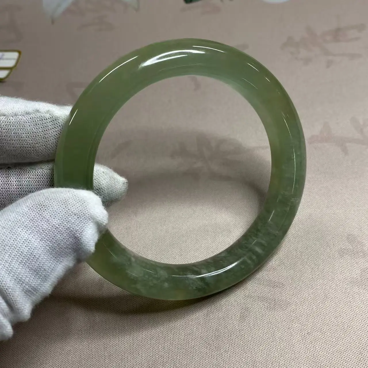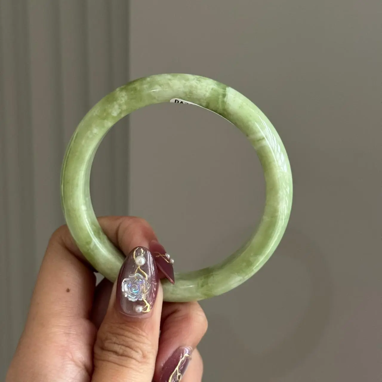 Gelang Bangle Giok Xiuyu Xiuyan Hijau Muda dengan motif susu, 100% asli dan alami. Dilengkapi dengan sertifikat resmi. Cocok untuk Anda yang mencari aksesori alami dan asli.