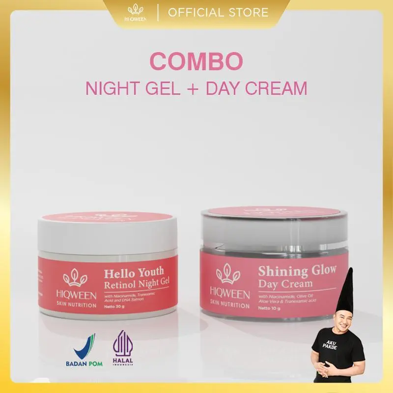 HIQWEEN RETINOL NIGHT GEL + SHINING GLOW DAY CREAM WITH SUNSCREEN Krim Siang Malam Niacinamide Mencerahkan Pencerah Kulit Flek Hitam Melasma Wajah Tranexamic Acid Aging
