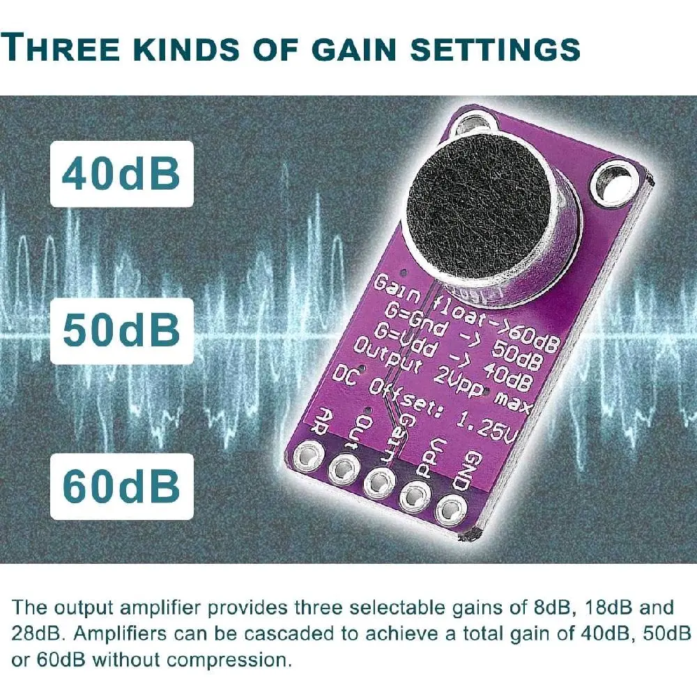 Modul ini menyediakan tiga pilihan pengaturan gain 40 dB untuk sumber suara keras, 50 dB untuk penggunaan serbaguna, dan 60 dB untuk deteksi suara lembut atau dari jarak jauh yang dapat dipilih melalui pin konfigurasi. Penguatan yang dapat disesuaikan ini memberikan fleksibilitas penuh untuk berbagai kebutuhan audio profesional maupun eksperimen.