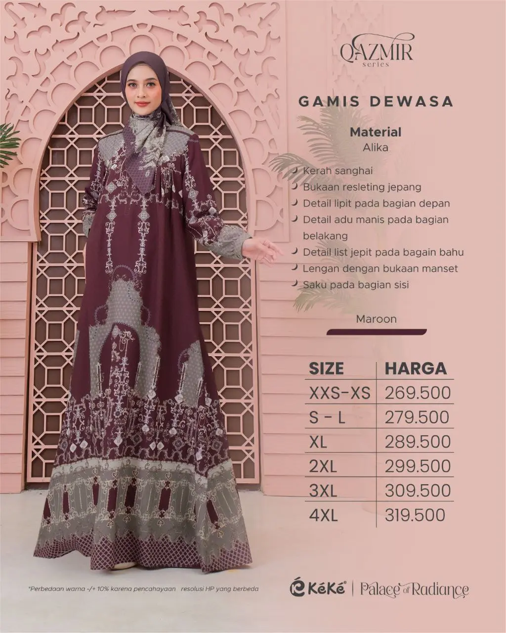 ·Gamis Dewasa (XS): IDR 269.500, 279.500 (S-L), 289.500 (XL), 299.500 (XXL), 309.500 (3XL), 319.500 (4XL) (TIDAK TERMASUK JILBAB)