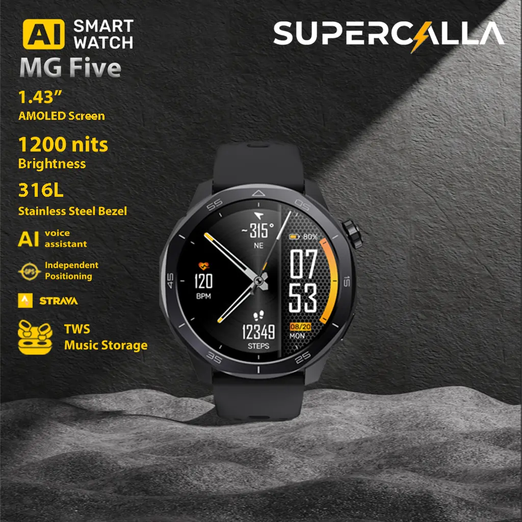 MG Five Supercalla adalah smartwatch premium untuk olahraga, aktivitas outdoor, dan pemakaian harian. Menggabungkan GPS mandiri, musik tanpa HP, koneksi TWS, serta AI Voice Assistant yang memudahkan kontrol smartwatch hanya dengan perintah suara.