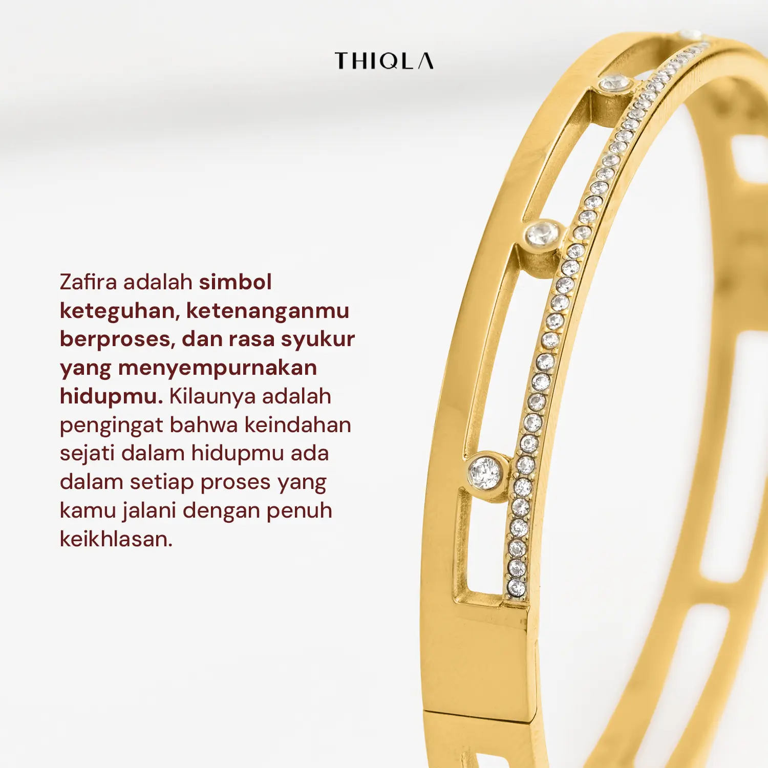 Melengkapi keseluruhannya, permata-permata kecil di bagian bawah menjadi simbol apresiasi dan rasa syukur atas hal-hal sederhana dalam keseharianmu. ZAFIRA adalah simbol keteguhan, ketenanganmu berproses, dan rasa syukur yang menyempurnakan hidupmu.