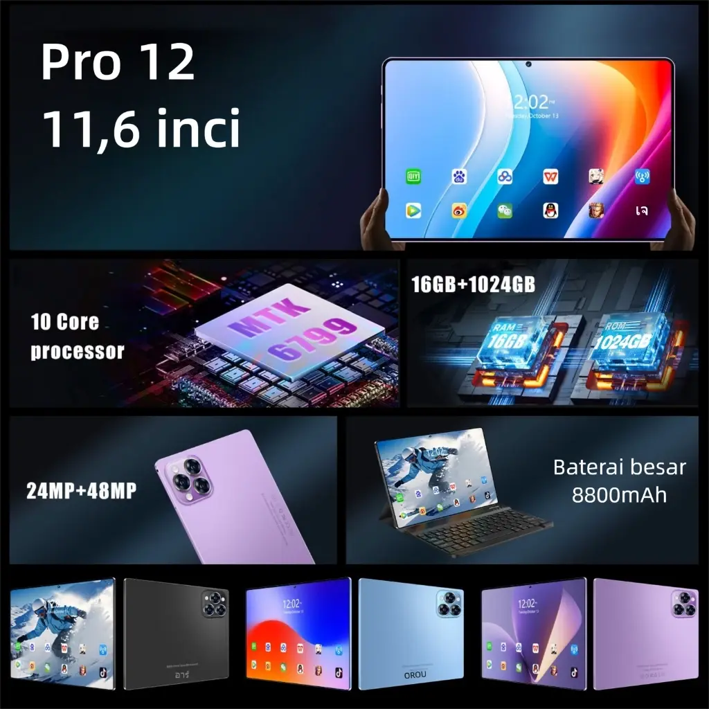 【Sarung Tablet Gratis】 Tab Pro12 Tablet PC Baru Android murah11.6inch 16GB+1TB Wifi 4G/5G Dual SlM smart Tablets 1024GB Untuk Anak Belajar hp tablet gaming tab BluetoothLayar