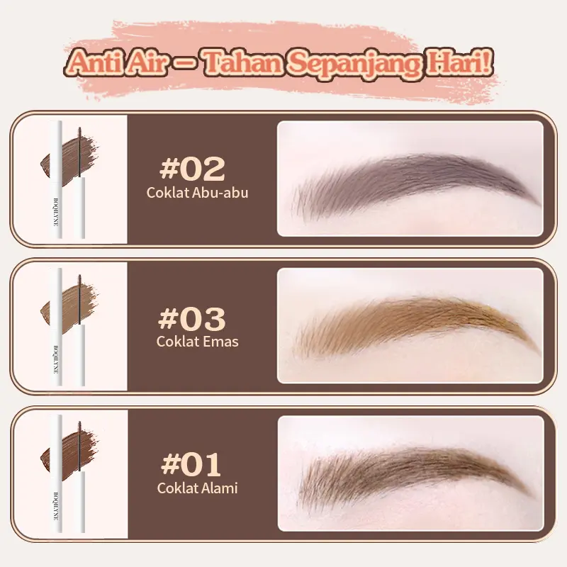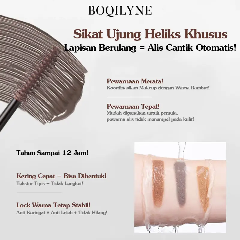 BOQILYNE Eyebrow & Mascara dirancang untuk tahan air dan keringat. Ini menjamin bahwa produk akan tetap tetap dalam waktu yang lama. Anda tidak perlu khawatir tentang produk lepas saat beraktivitas.