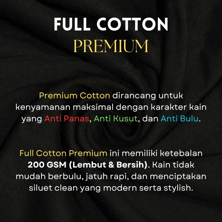 Terbuat dari 100% katun top quality, kaos ini terasa sangat halus, lembut di kulit, dan tetap adem dipakai sepanjang hari. Bahan eksklusifnya juga anti bulu dan anti kusut, sehingga tetap rapih dan bersih meskipun dipakai lama.