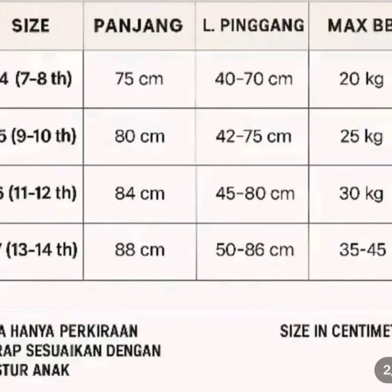 Mohon Sesuaikan size dengan tubuh anak, karena postur anak berbeda