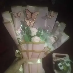 Terdapat 4 tangkai bunga dan 5 kupu2 dengan plastik hologram