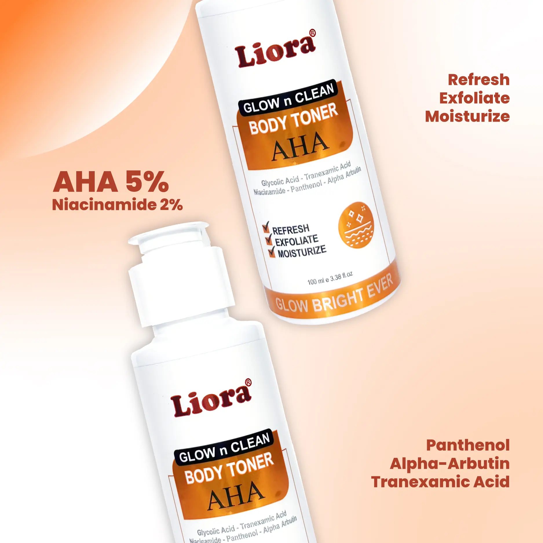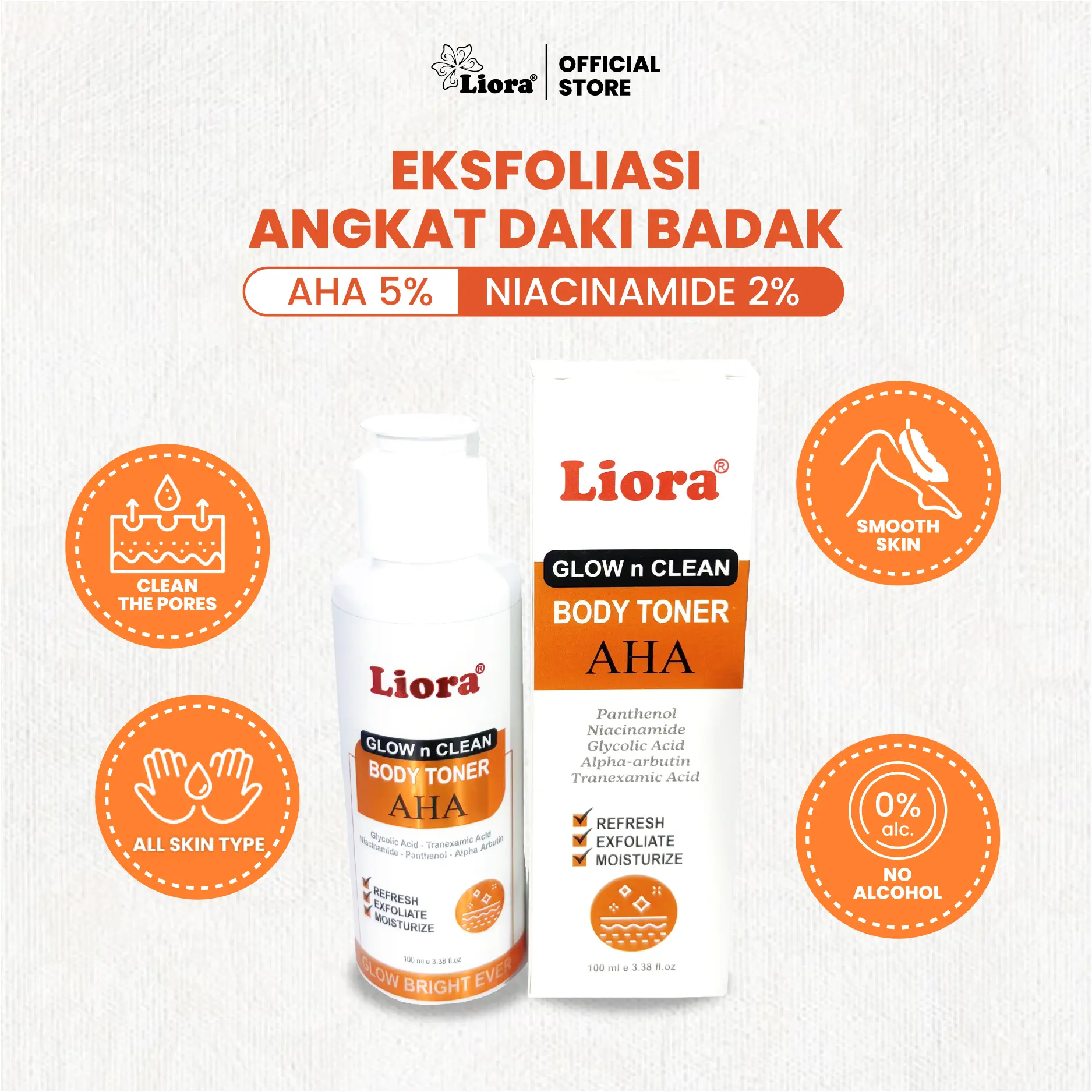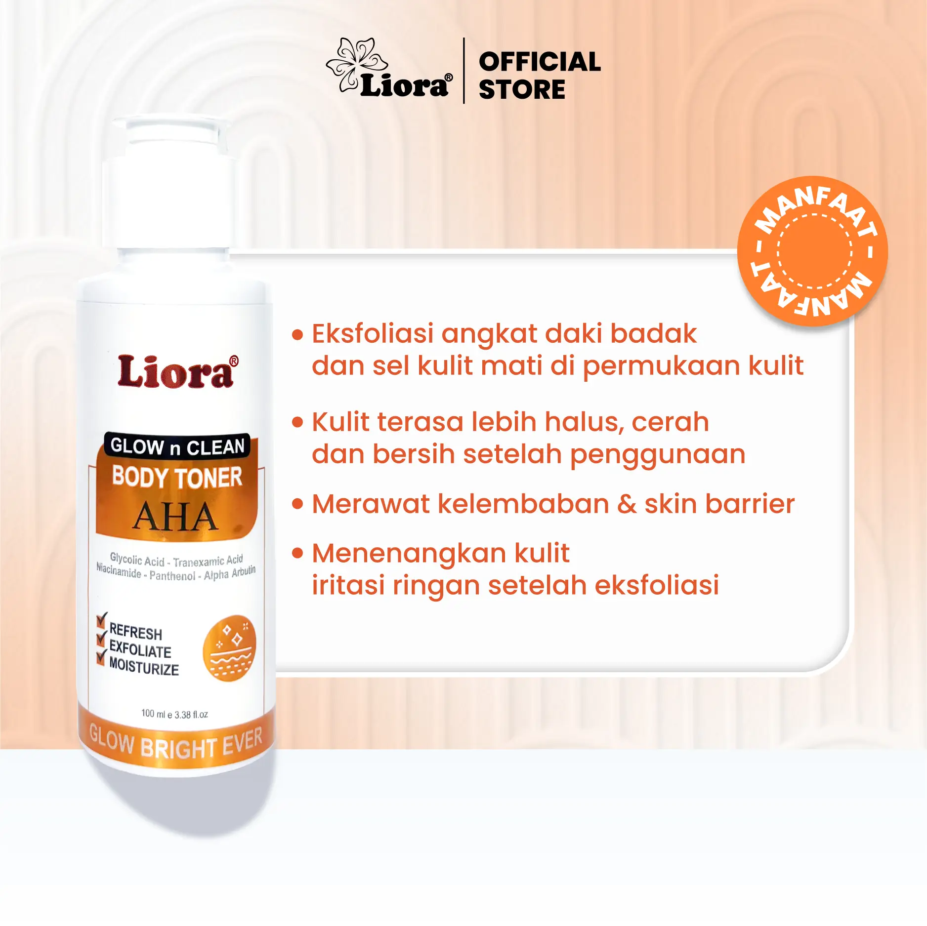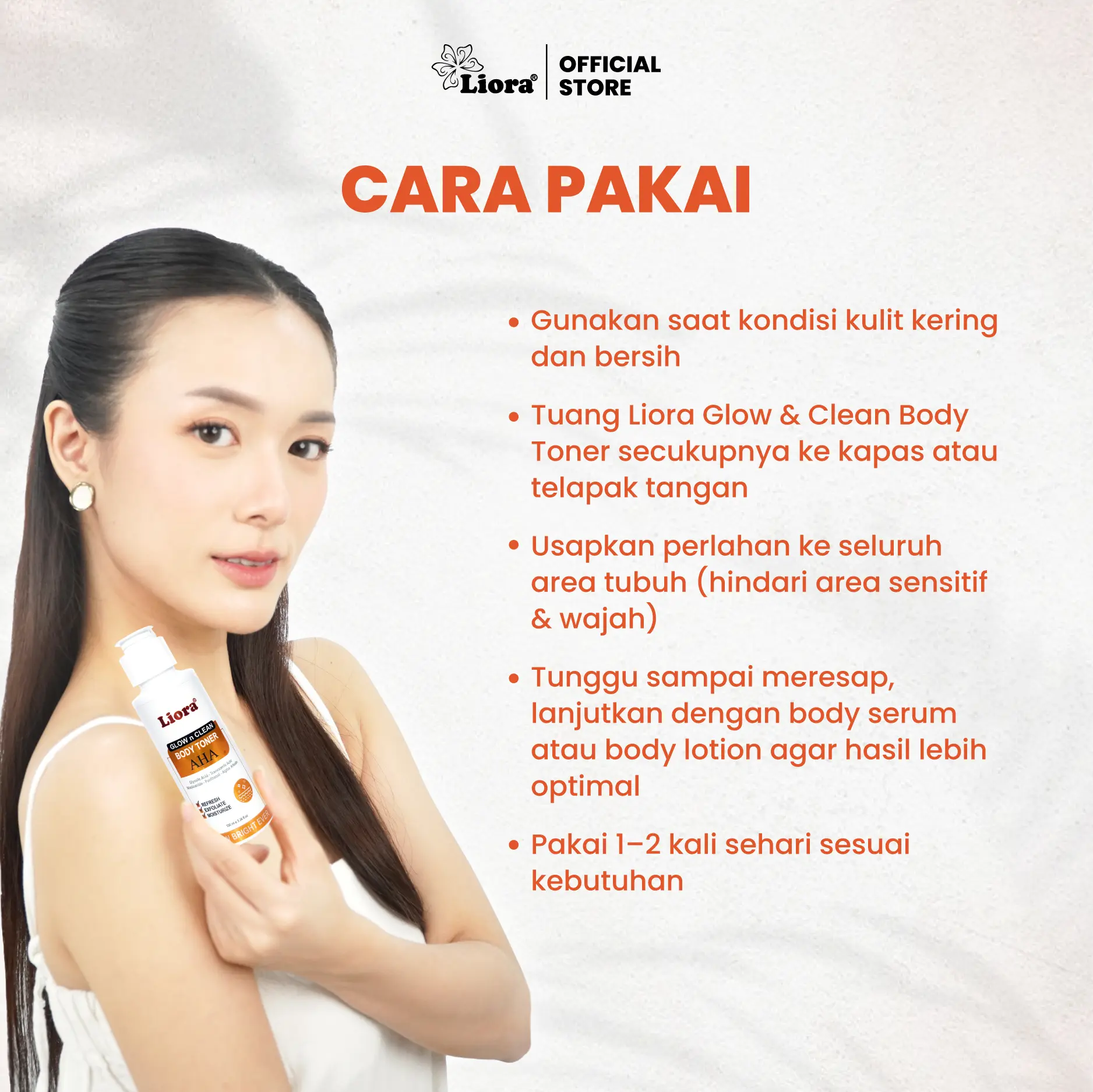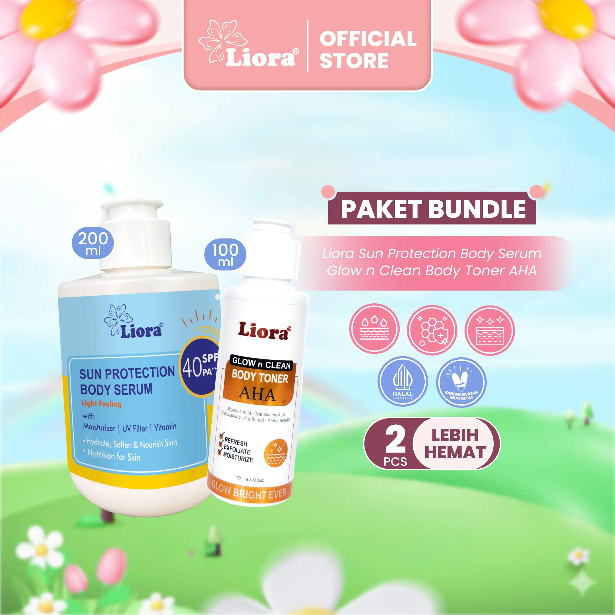 Kombinasi LIORA Glow and Clean Body Toner AHA dan LIORA Sun Protection dirancang untuk membantu membersihkan dan mengangkat sel kulit mati, sekaligus melindungi kulit dari paparan sinar matahari agar kulit tetap tampak cerah, sehat, dan terawat.