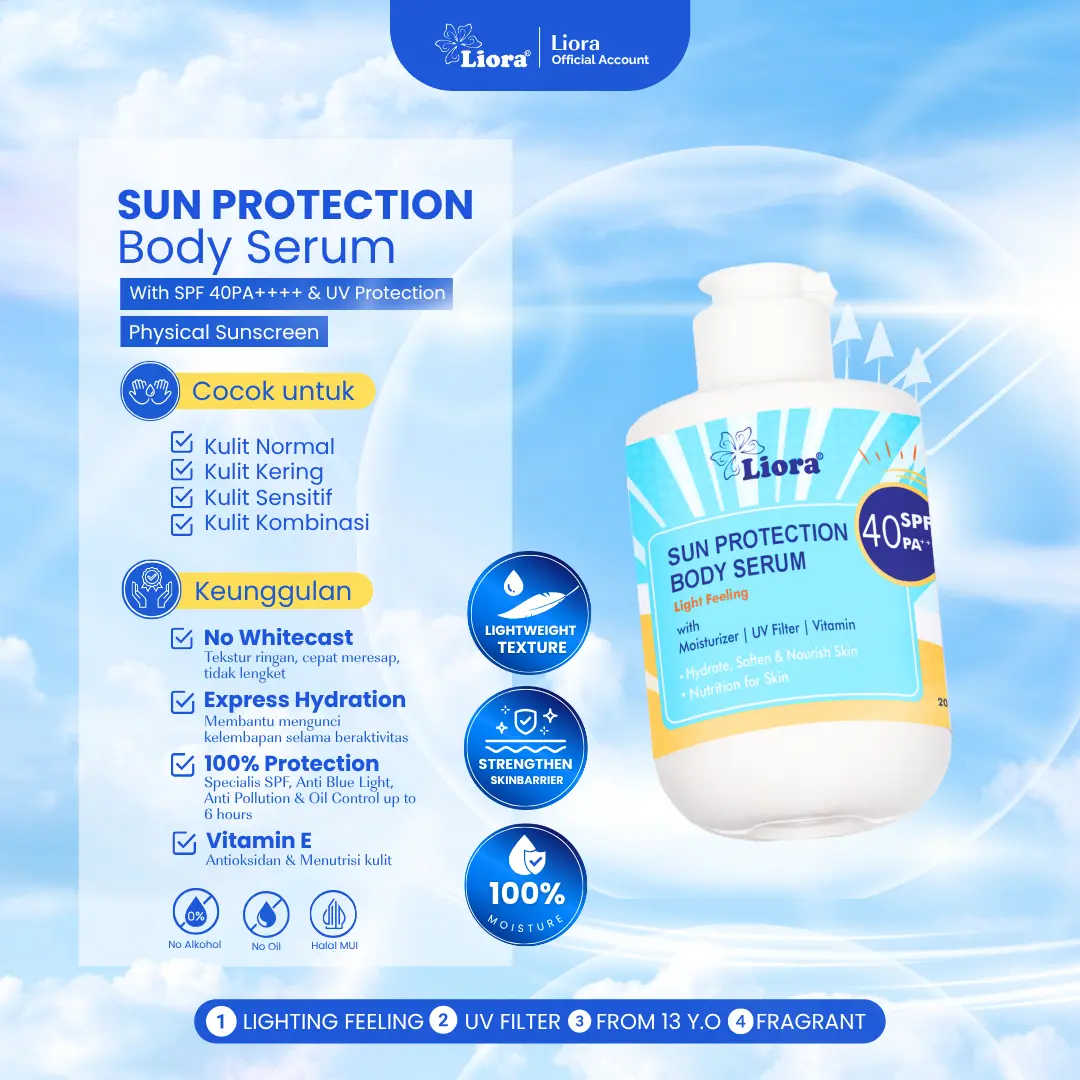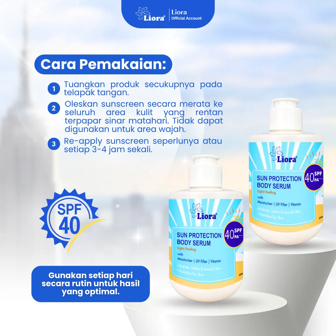 Body Toner AHA membantu mempersiapkan kulit dengan eksfoliasi lembut, sehingga kulit lebih siap menerima perlindungan. Sementara LIORA Sun Protection membantu melindungi kulit dari sinar UVA & UVB, menjaga kelembapan, serta membantu mencegah kulit tampak kusam akibat paparan sinar matahari.
