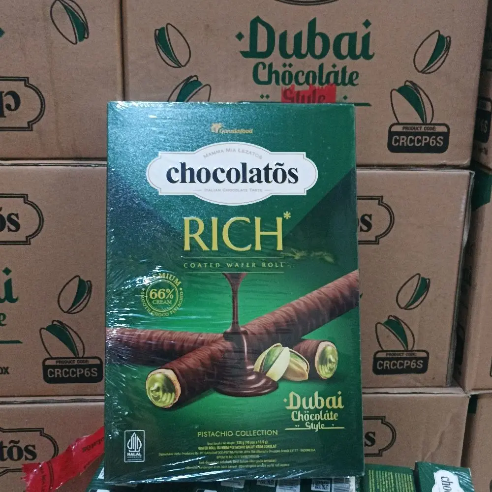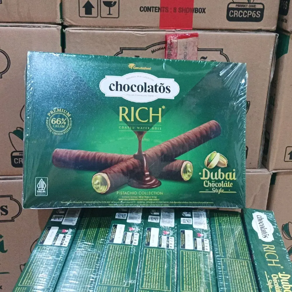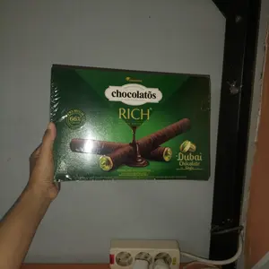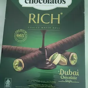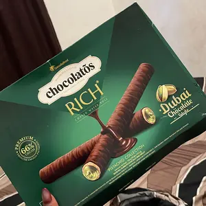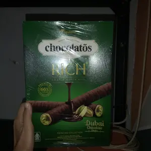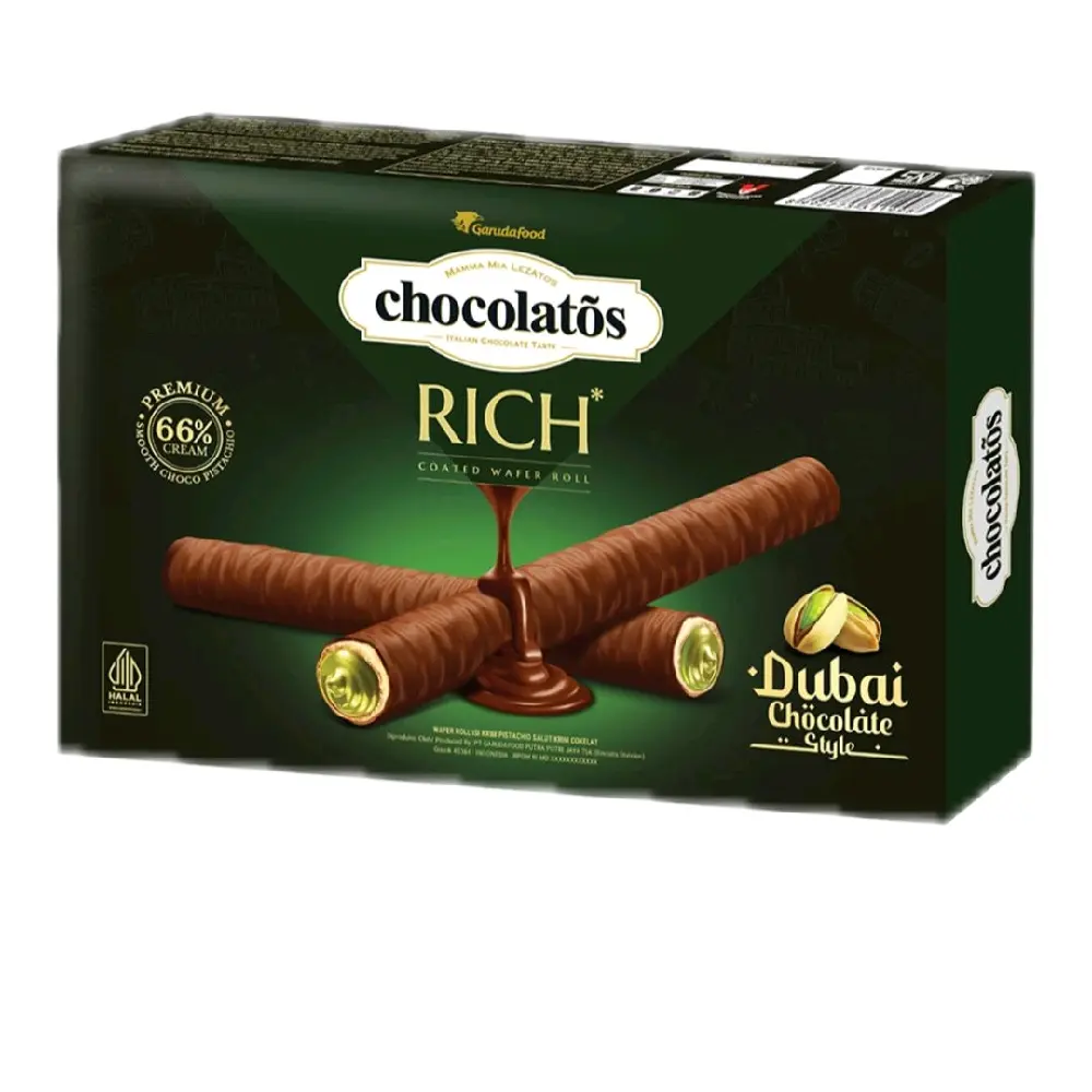 Chocolatos Wafer Roll Rich Dubai Chocolate 135 gย wafer roll premium dengan lapisan cokelat halus yang memikat. Dibuat dengan cokelat berkualitas tinggi,ย Chocolatos Wafer Roll Rich Dubai Chocolate 135 gย menyajikan rasa cokelat yang lebih dalam dan memuaskan. Tiap gigitannya membawa perpaduan sempurna antara wafer renyah dan cokelat lembut yang lumer di mulut.