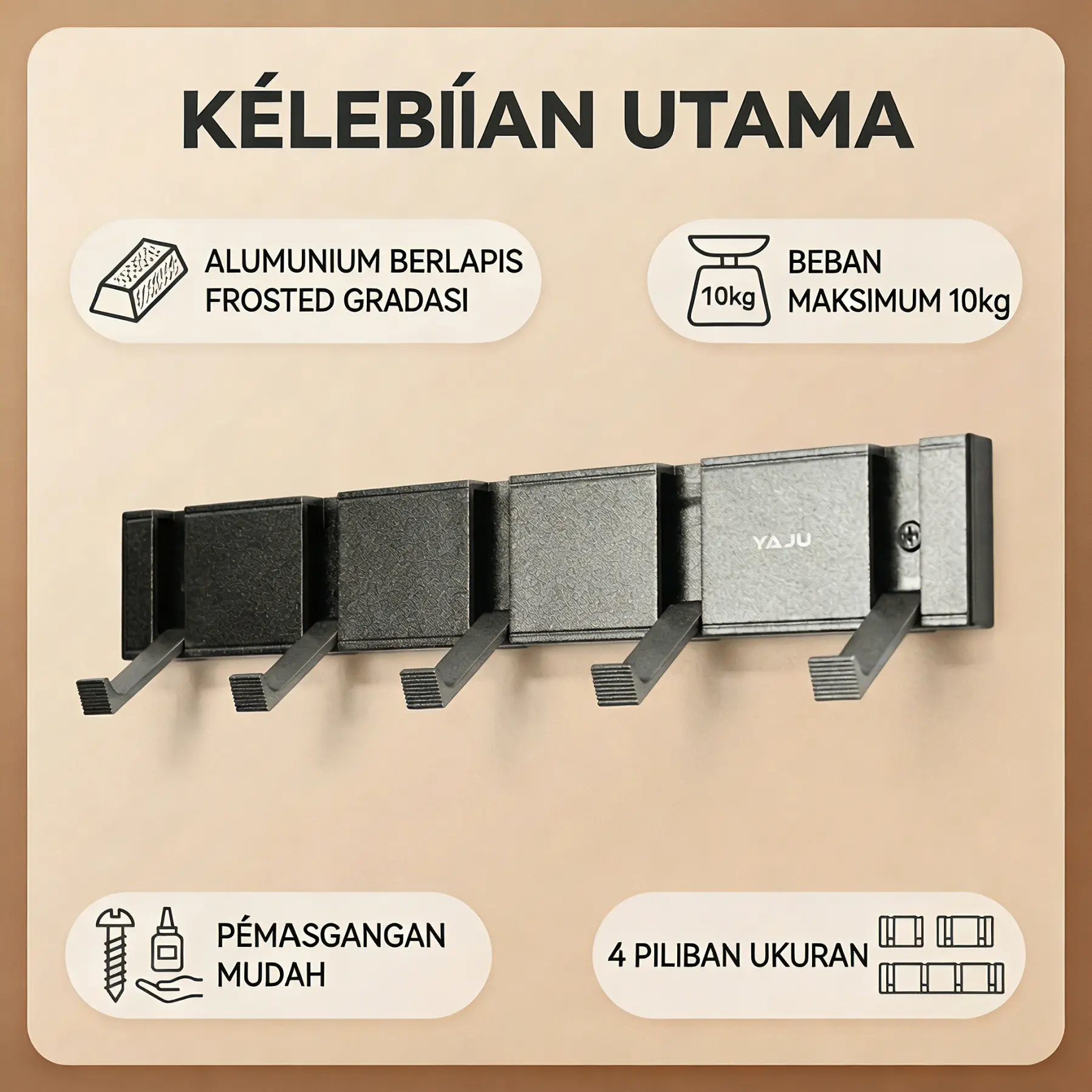 ·YJ-GJ-5505B: Kap Stok Aluminium (Black Finished) – 5 Pengait