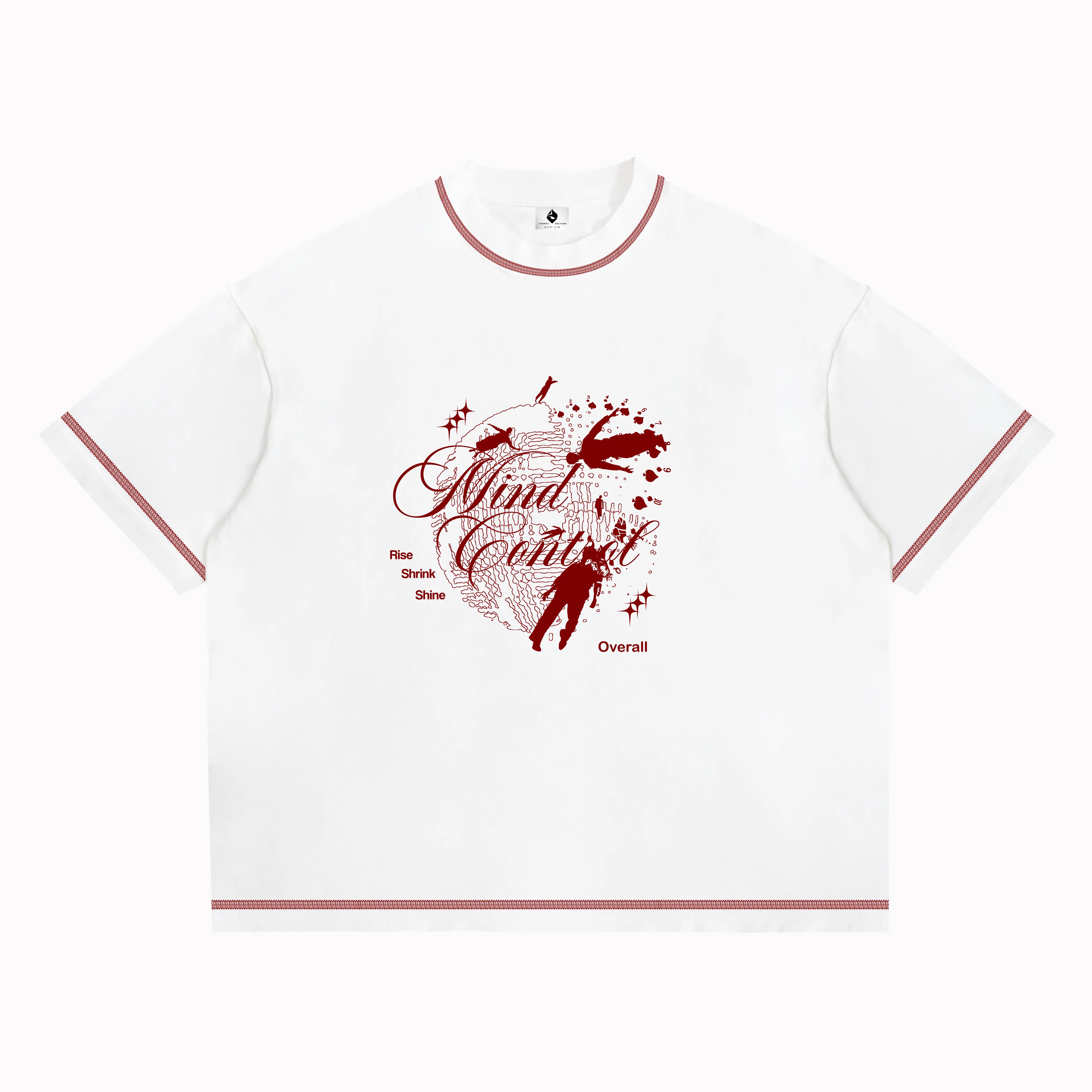 Serger Stitch Boxy Cut T-Shirt cotton 20s OverallDecking Mind maroon on WhiteSerger Stitch Boxy Cut T-Shirt cotton 20s OverallDecking Mind maroon on White