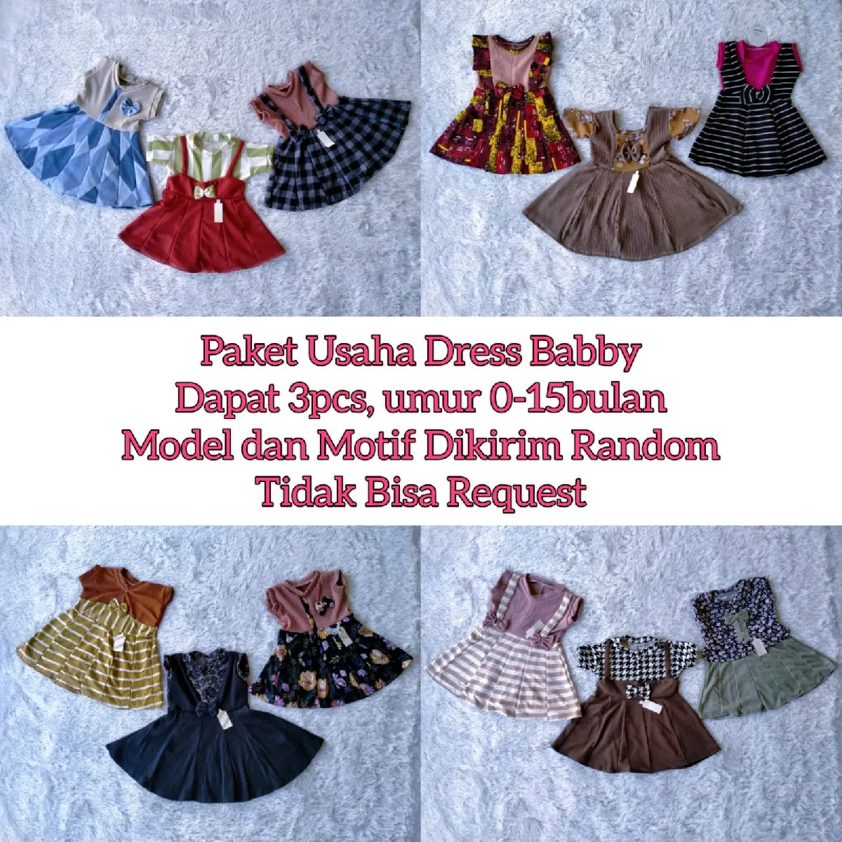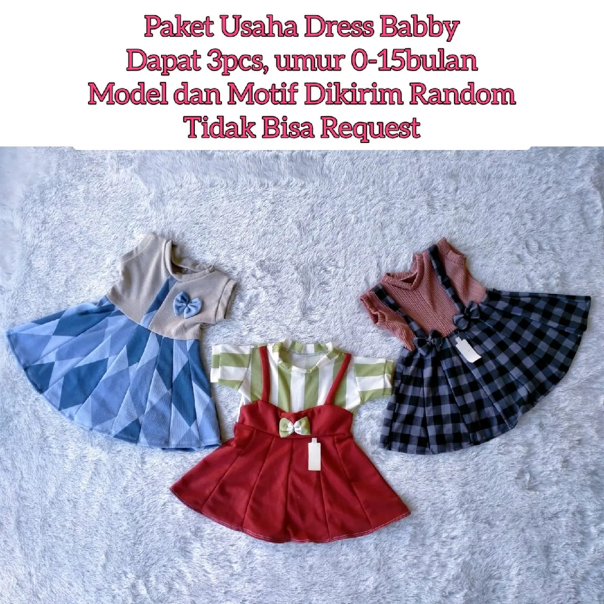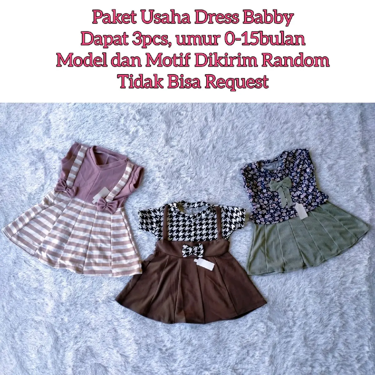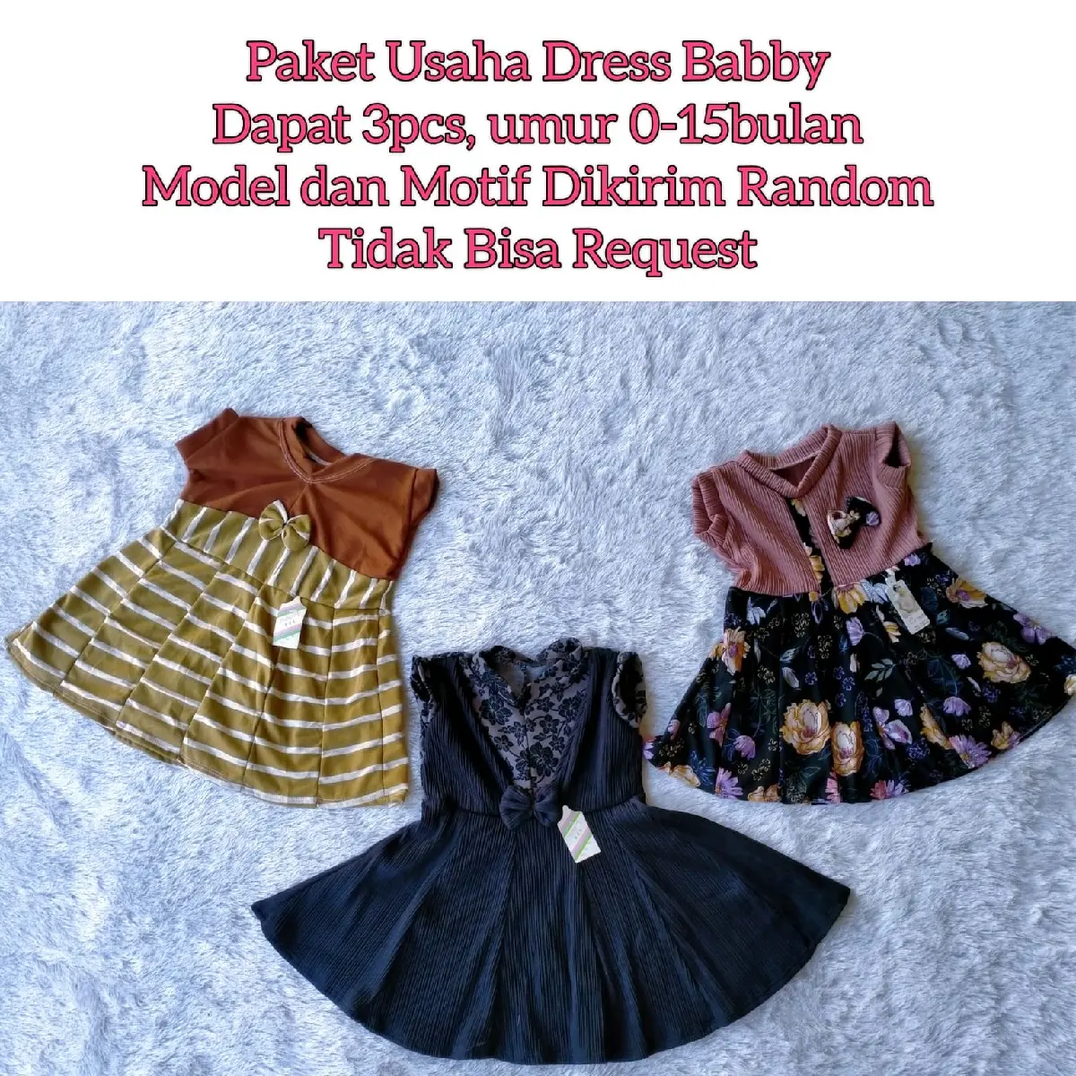 Paket usaha ini terdiri dari 3pcs dress baby cewek yang cocok untuk si kecil yang berusia 0-15 bulan. Model dan motif dress akan dikirimkan secara random, sehingga Anda akan mendapatkan kejutan saat menerima paket ini. Namun, jangan khawatir karena semua model dan motif yang tersedia sangat lucu dan menarik.