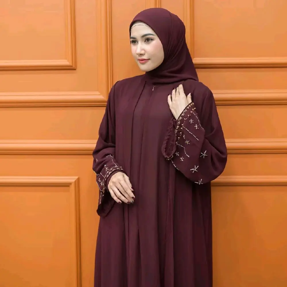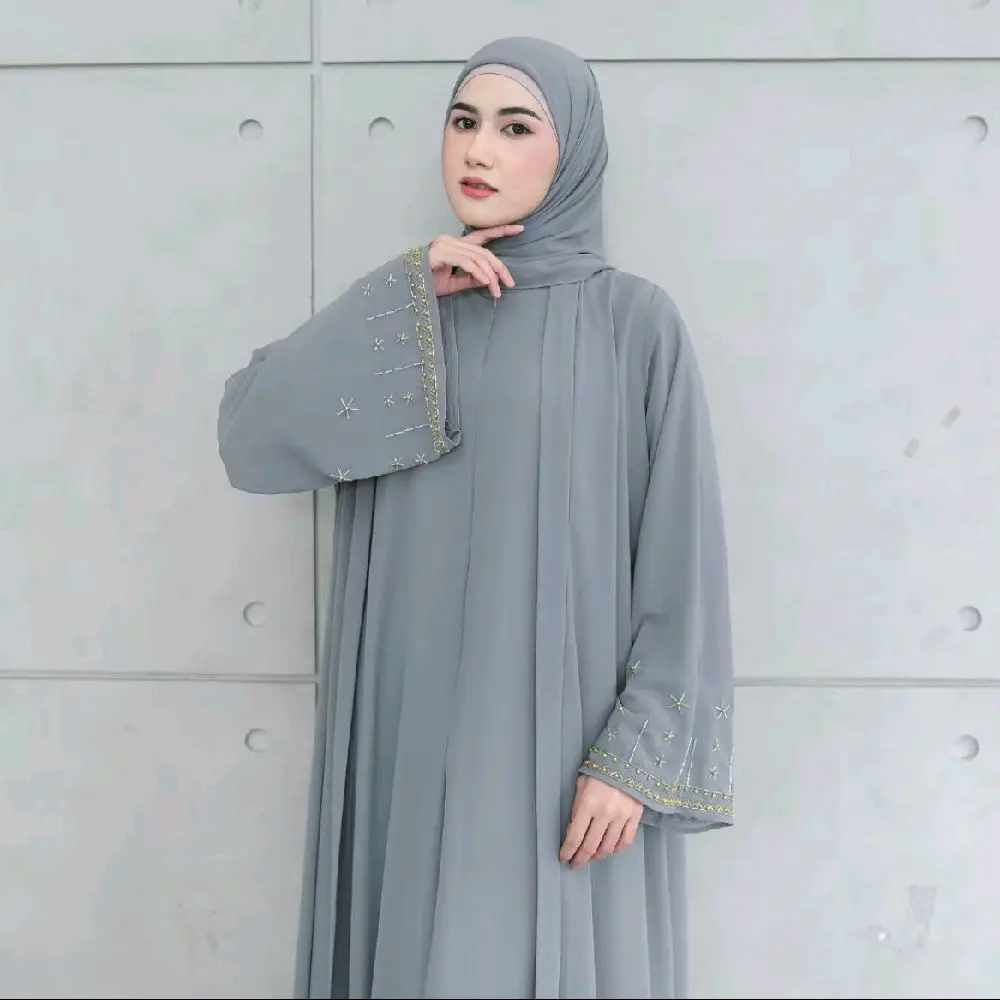 Alana Abaya Kekinian Bahan Ceruty Baby Doll Mix Payet ada tiga warna Burgundy soft Pink dan Grey dengan Desain yang menarik