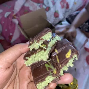 Kepo sama varian Kunafa Pistachionya. Rasa lebih mirip matcha daripada Kunafa Pistachio. Isiannya juga manis banget, kurang cocok di lidah. Ukuran kecil utk seharga 15K ๐๐ป Dapet 10 potong kecil. Coklat luarannya lumayan enak. Terima kasih kak seller