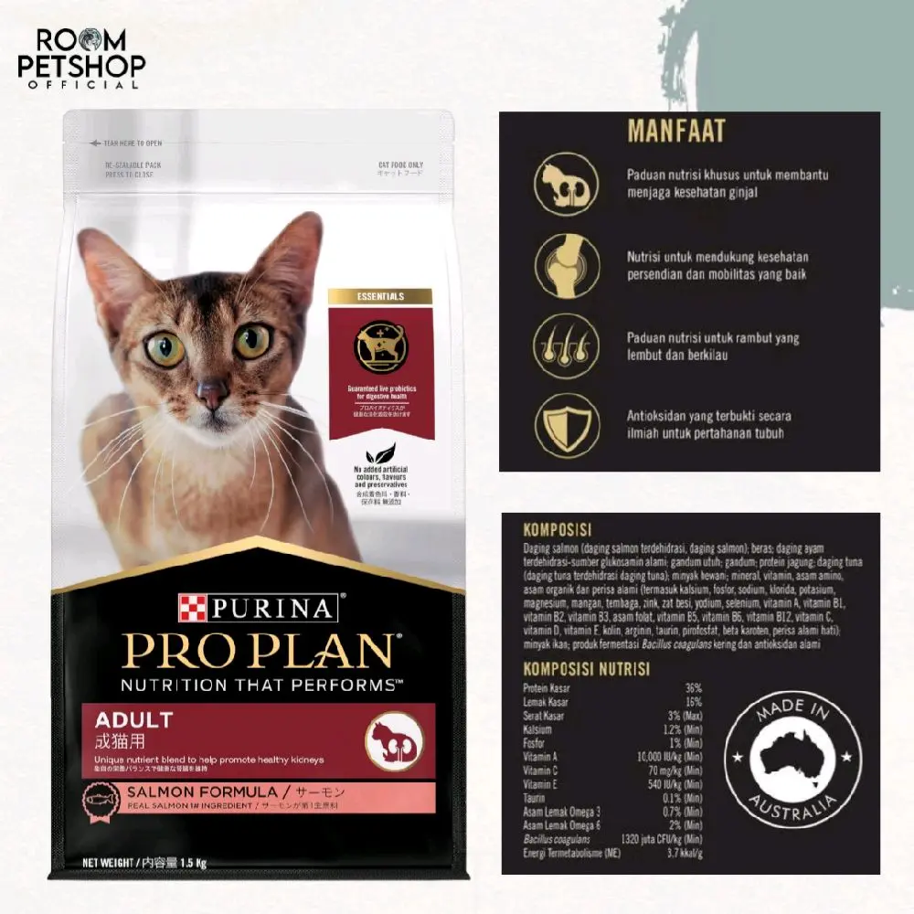 Pro Plan Adult Salmon adalah makanan kucing kering berkualitas tinggi dari Purina yang diformulasikan dengan salmon asli sebagai bahan utama, kaya protein untuk otot dan sistem imun, serta mengandung nutrisi seperti Optirenal untuk kesehatan ginjal, probiotik untuk pencernaan, serta Omega-3 untuk kulit dan bulu berkilau, ideal untuk kucing dewasa aktif yang membutuhkan nutrisi lengkap dan mendukung kesehatan jangka panjang.